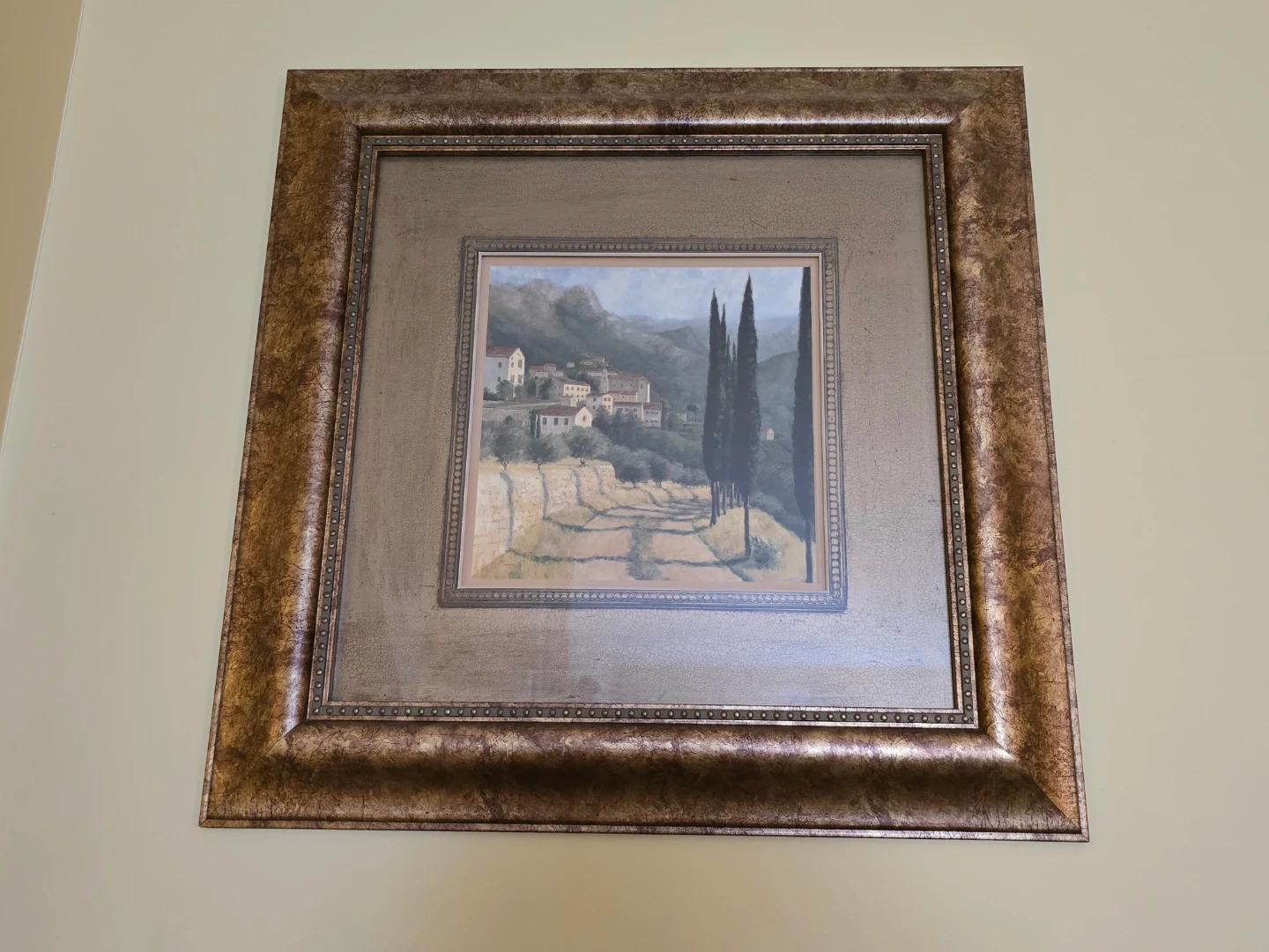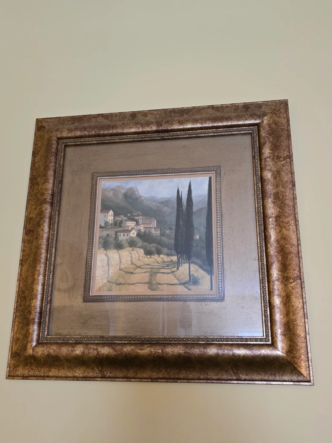 Framed decorative artwork featuring a Tuscan landscape scene with cypress trees and a village. It's housed in a decorative metallic gold finish frame.