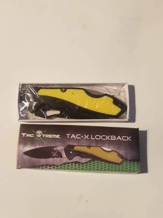 TAC X Lockback folding knife. Features a black and yellow handle. Comes in original packaging. brand new couple available $9 each