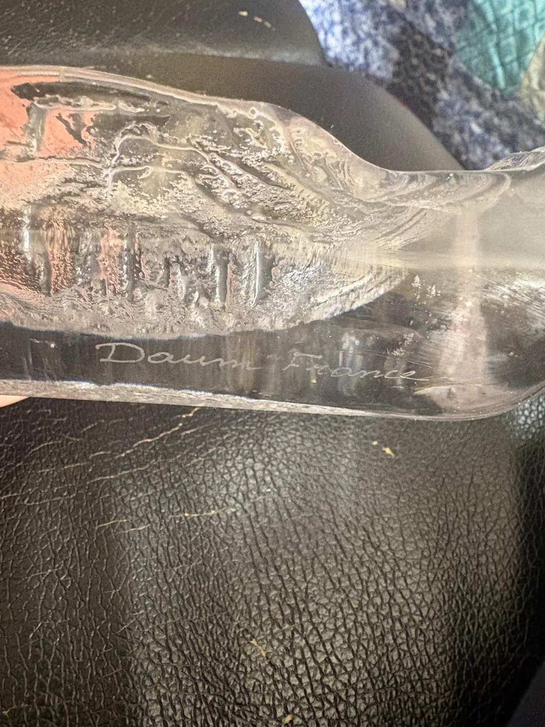 This is a beautiful crystal ashtray from Daum. It has a unique textured design etched into the glass. Perfect for a collector or as a stylish addition to a coffee table.