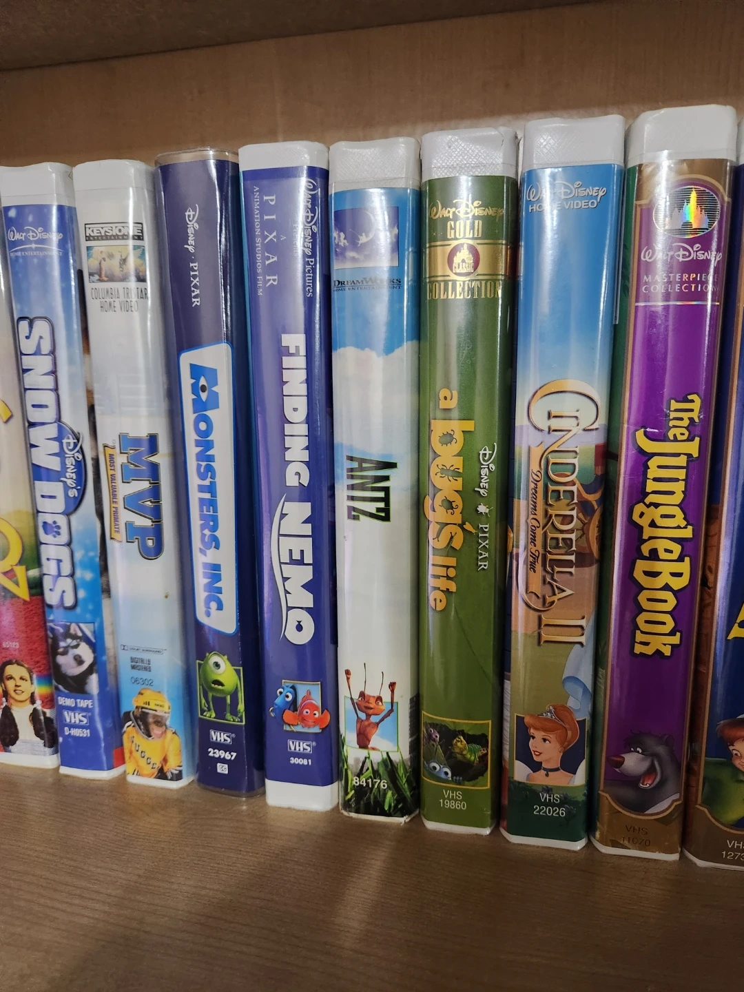 A selection of classic Disney and family movies on VHS tape. Includes titles from Pixar, Walt Disney, and Warner Bros. These tapes are great for a nostalgic movie night!