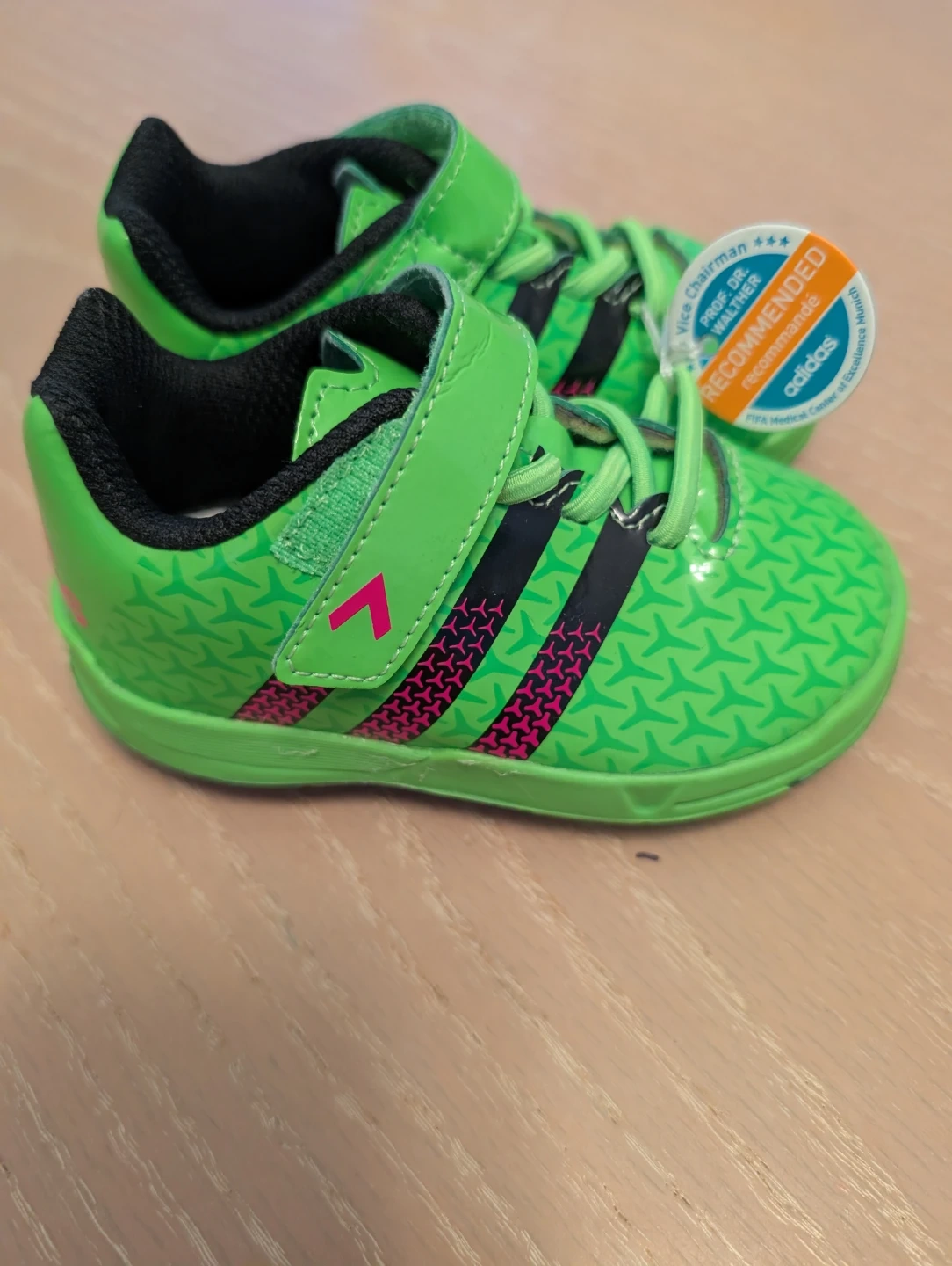 Bright green Adidas soccer cleats for toddlers. Features Velcro straps and laces for a secure fit. Durable material for active play.