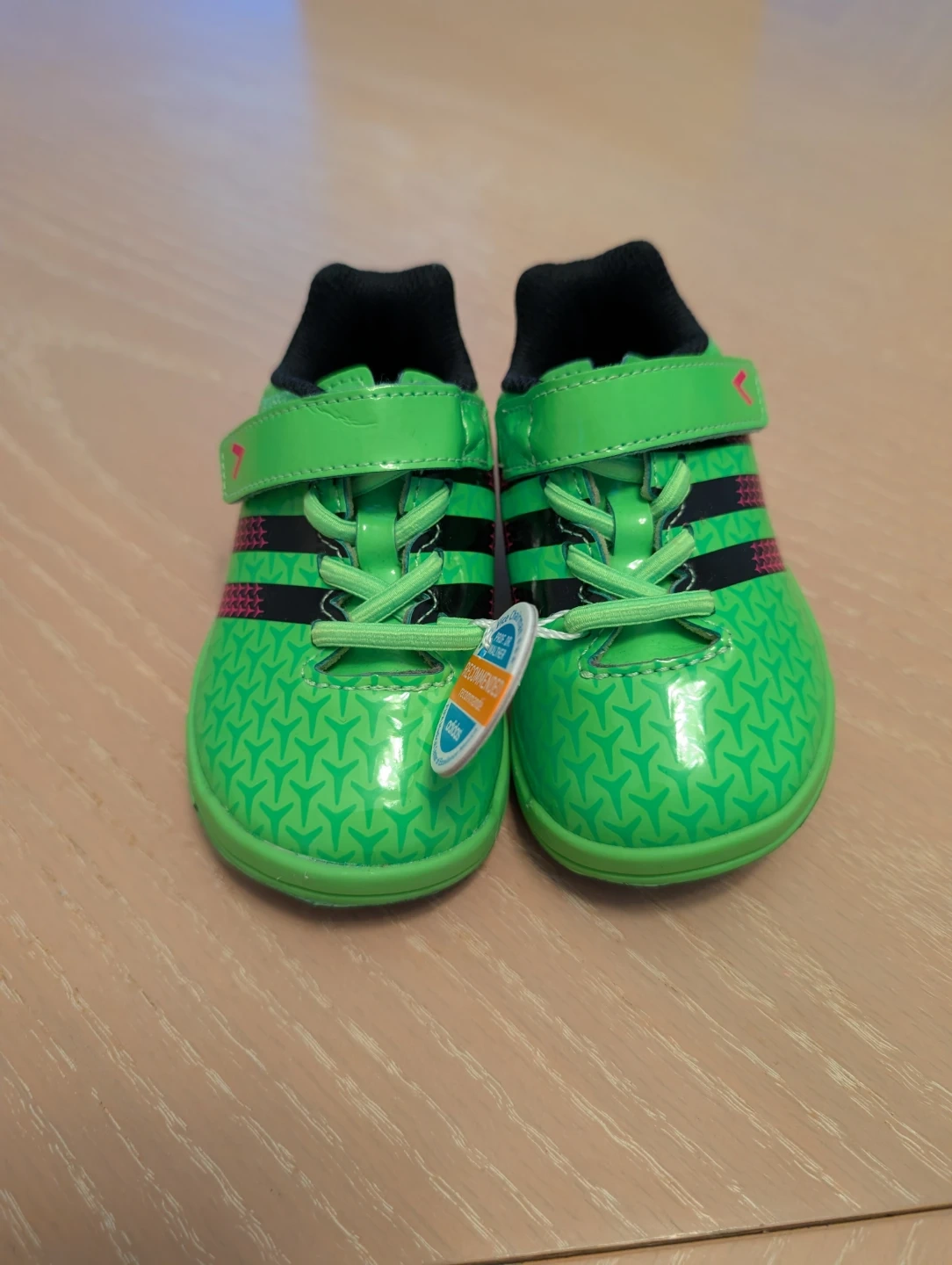 Bright green Adidas soccer cleats for toddlers. Features Velcro straps and laces for a secure fit. Durable material for active play.