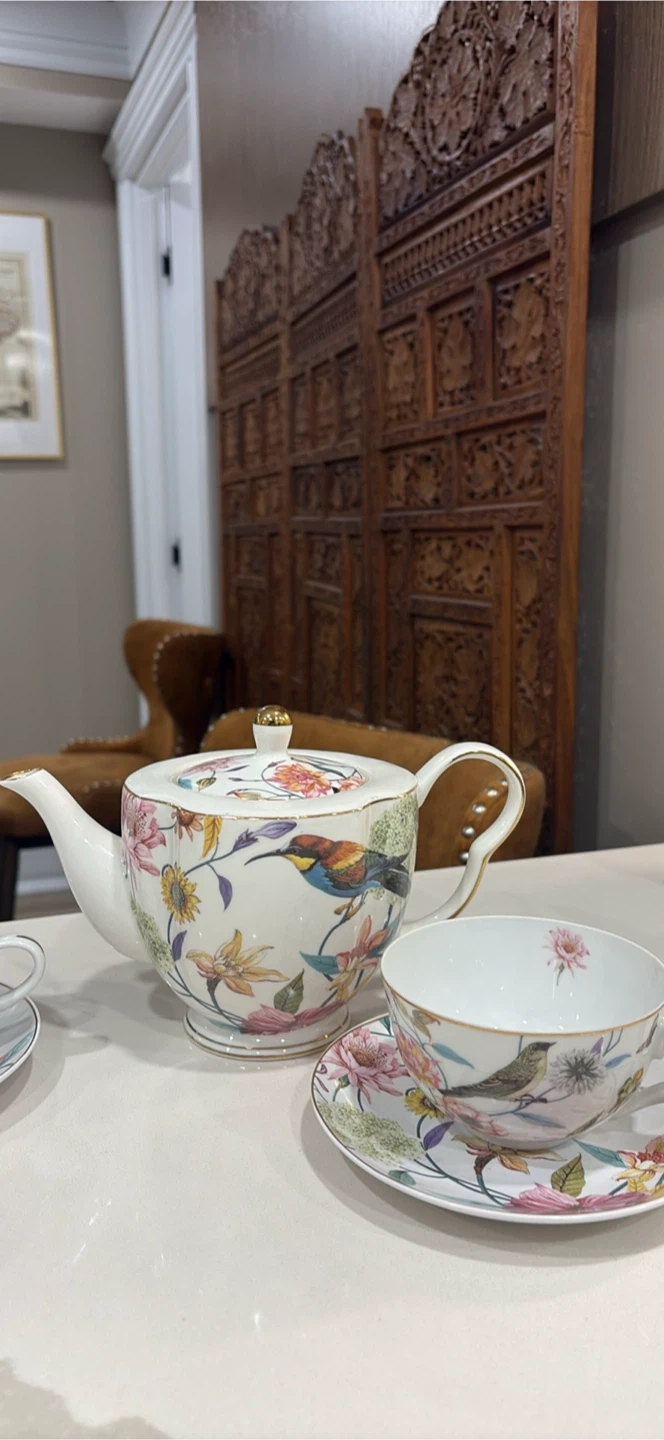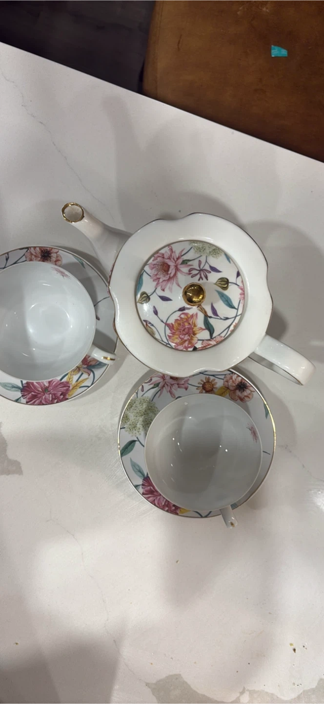 Beautiful tea set has one teapot, two teacups, and two saucers. Features lovely floral and bird patterns with gold rims.