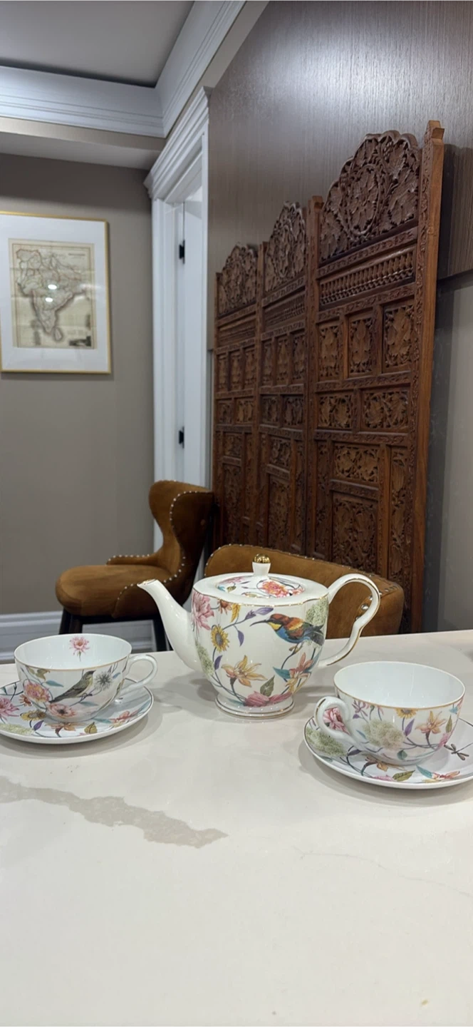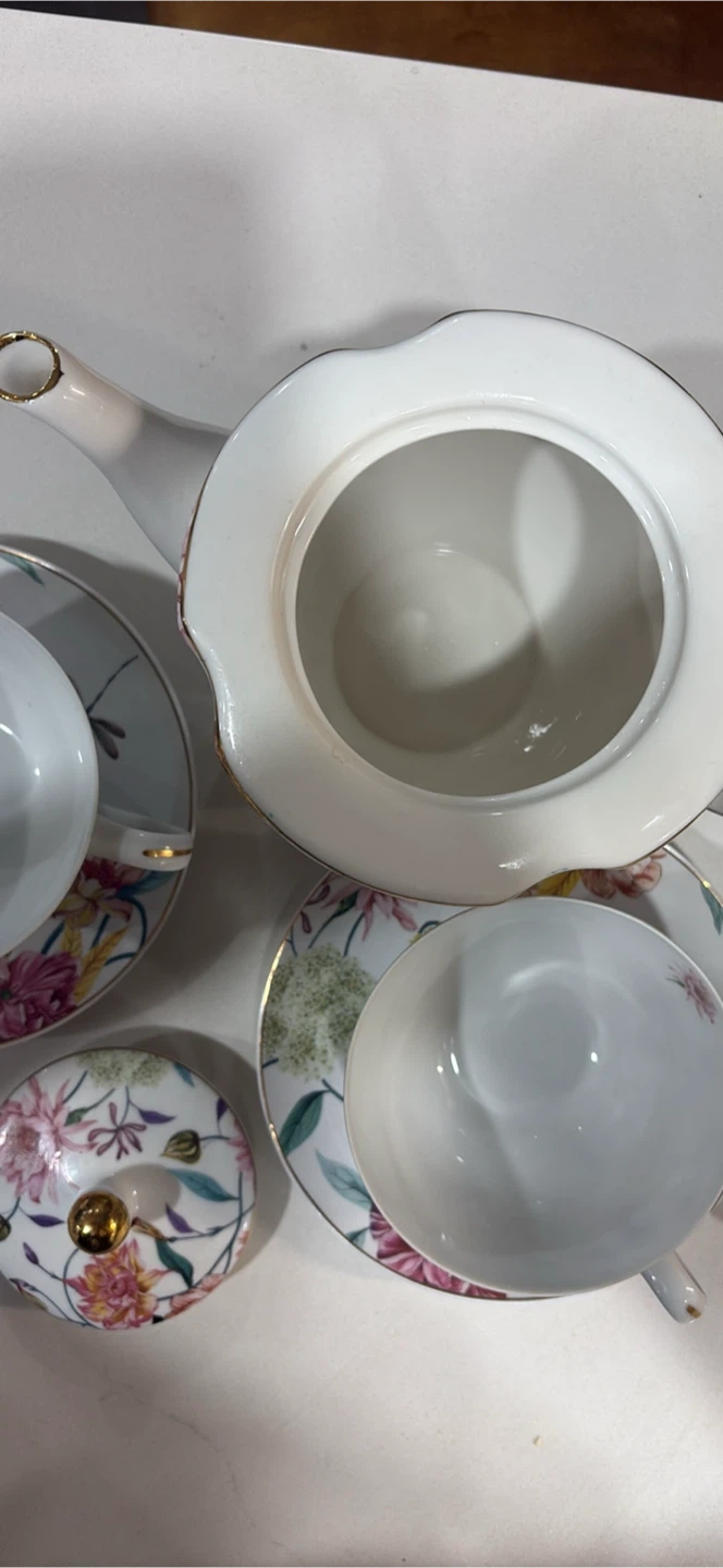 Beautiful tea set has one teapot, two teacups, and two saucers. Features lovely floral and bird patterns with gold rims.