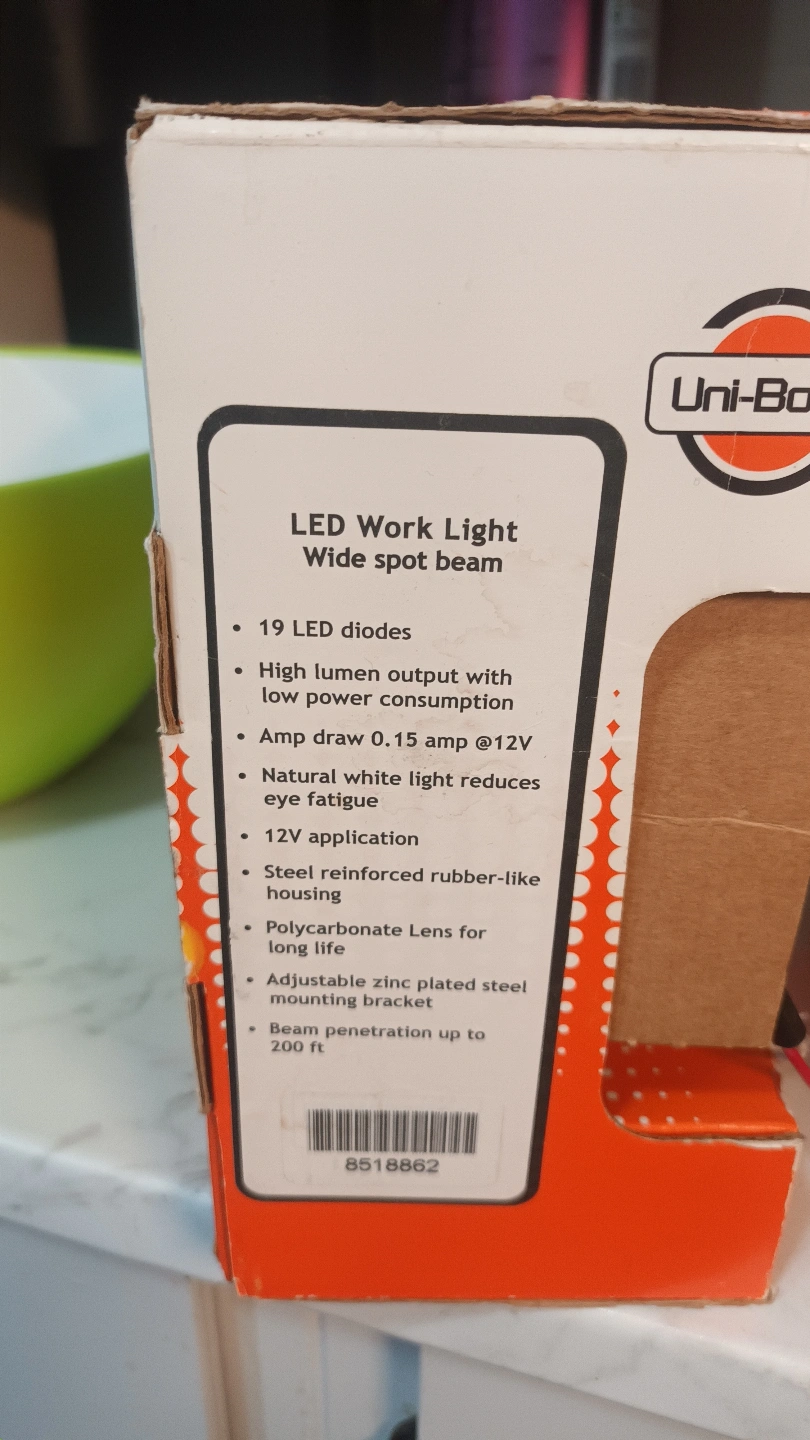 Two new Uni-Bond LED work lamps. Wide spot beam. 19 LED diodes. Low power consumption. Natural white light reduces eye fatigue. 12V application. Steel reinforced rubber-like housing. Polycarbonate lens. Adjustable zinc plated steel mounting bracket. Beam penetration up to 200 ft. Go oilers go.