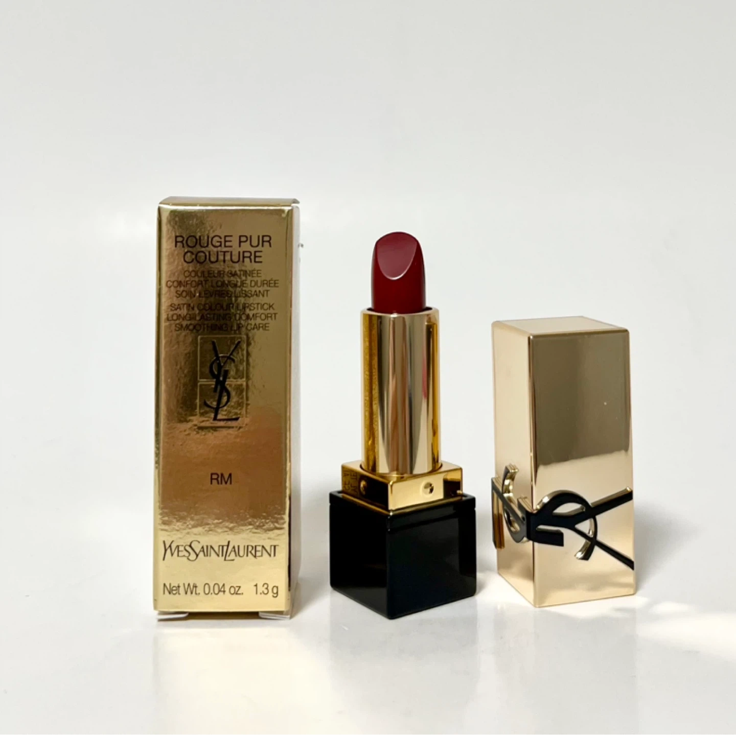 Introducing the Yves Saint Laurent Rouge Pur Couture lipstick in the shade RM, Rouge Muse. It's a satin colour lipstick designed for long-lasting wear and smoothing lip care. Net Wt. 0.04 oz, 1.3 g.