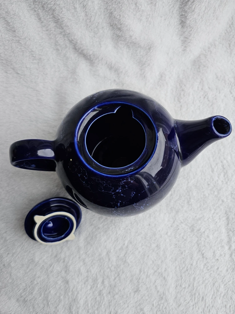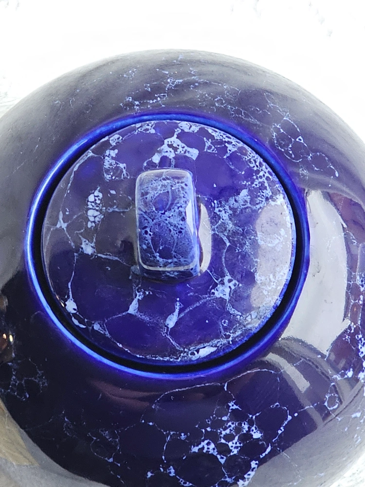 Simplicity is key! This dark blue & white 1L stonewear ceramic teapot features a unique bubble glaze in white. Likely made in the '80s, the Postmodern details still look fresh decades later!