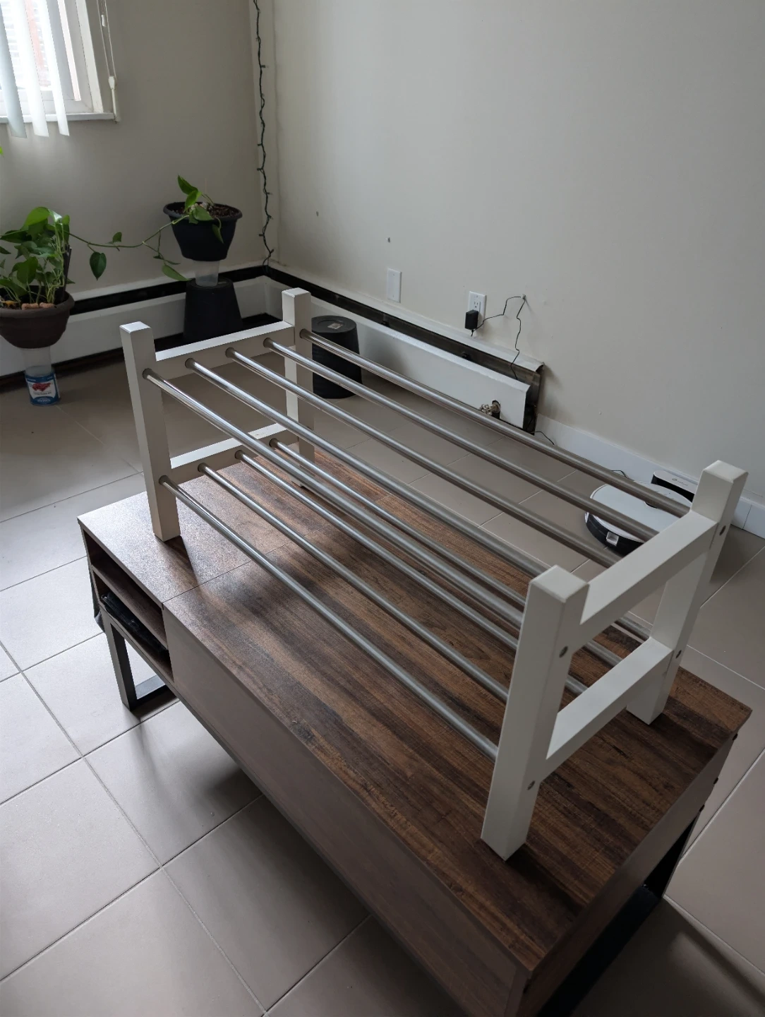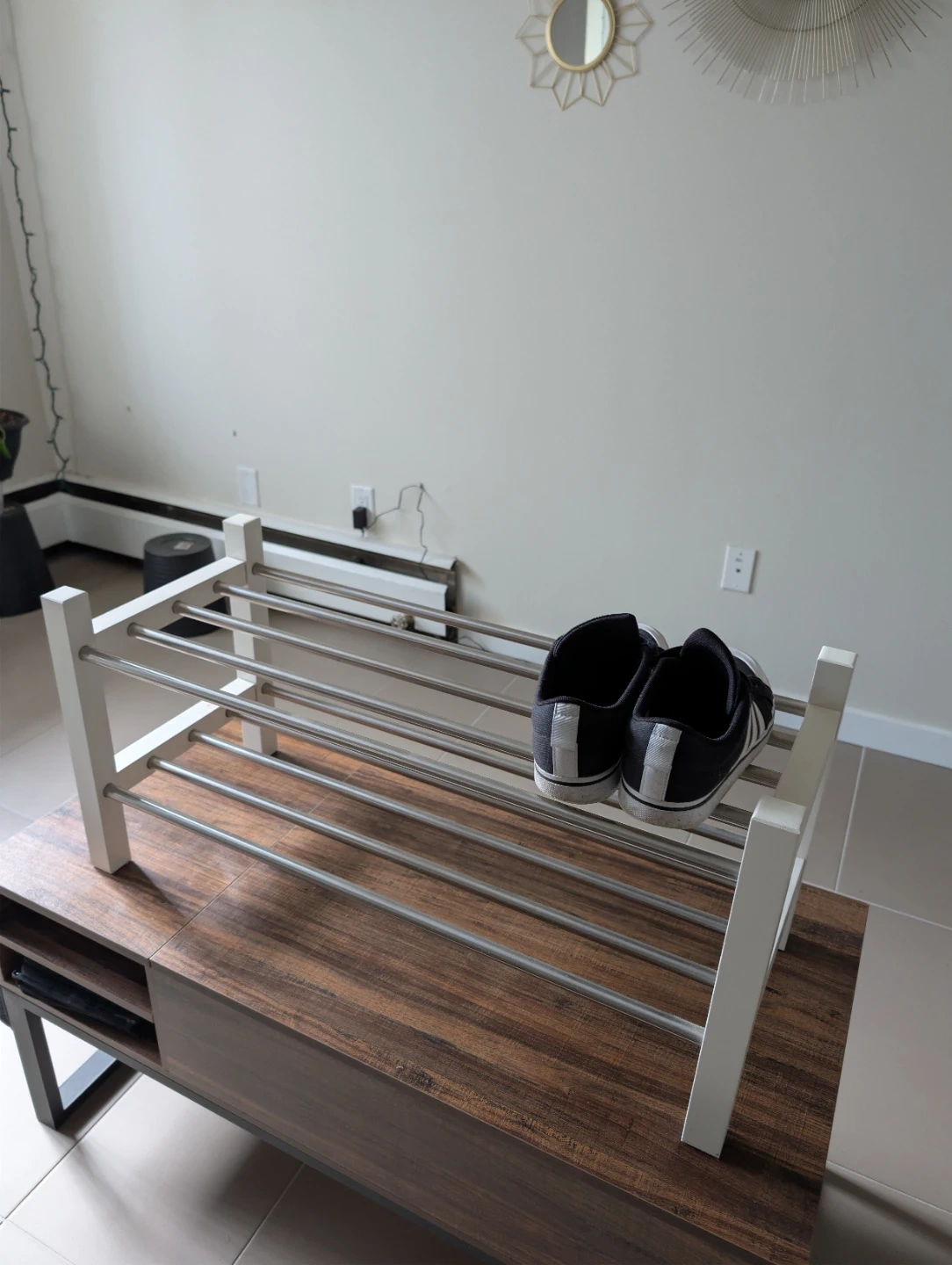 This shoe rack has a white frame with four metal shelves. It's great for organizing footwear. This rack is useful for keeping your entryway tidy!