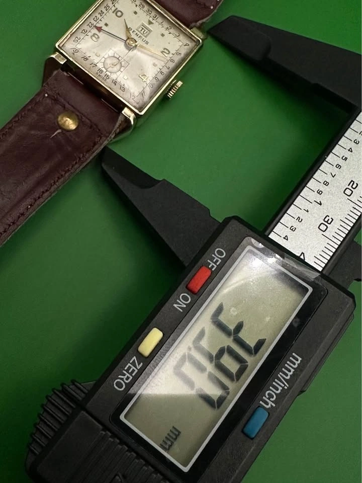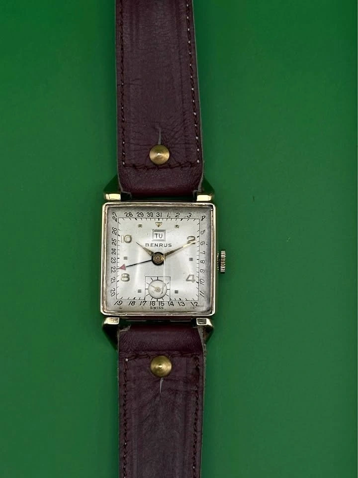 Vintage Benrus square calendar wristwatch from the late 1930s–early 1940s, featuring a classic Art Deco case and a rare multi-function dial layout. The dial is in perfect condition with no scratches, only on the glass.