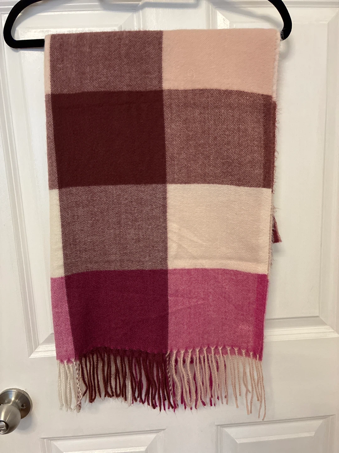 Cozy up with this stylish scarf! It features a lovely pink and brown plaid pattern with fringed edges. Perfect for adding a pop of colour to your fall and winter outfits
