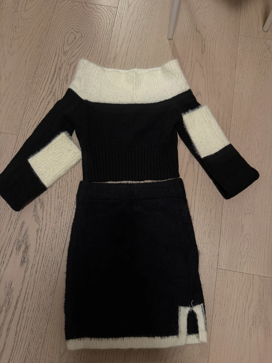 Here's a cute knit two-piece set in black and white! It's perfect for a stylish and cozy look. The set includes a top and a skirt, both made from a soft knit material. Great for any occasion!