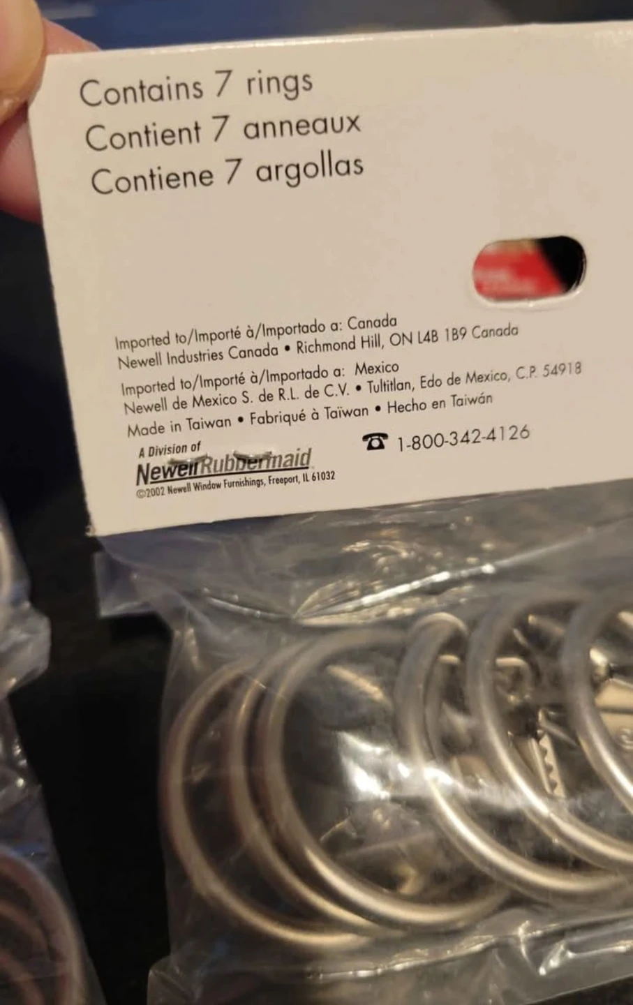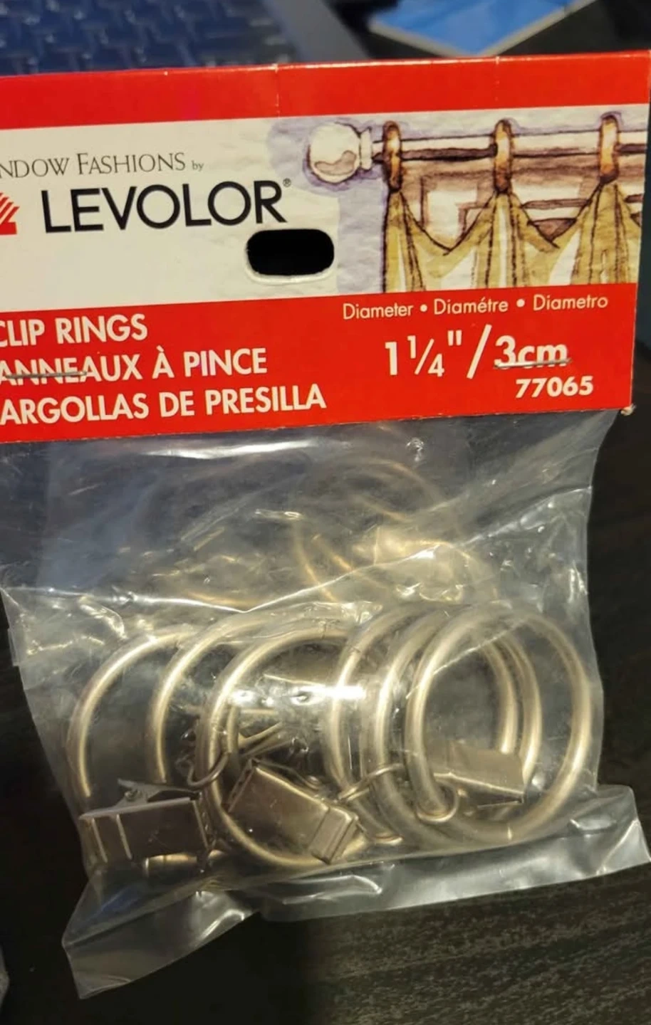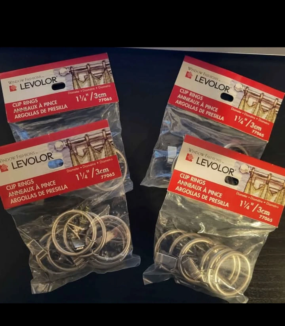 Four packages of Levolor clip rings are available. Each package contains 7 rings, for a total of 28 rings. Rings measure 1 1/4 inches or 3cm in diameter. They're suitable for hanging curtains or other draperies.