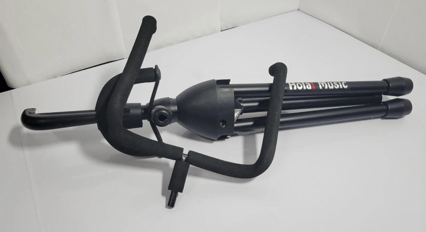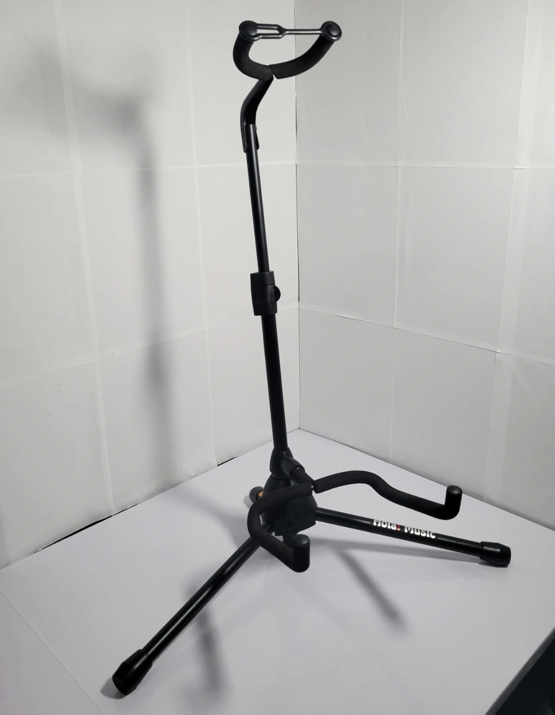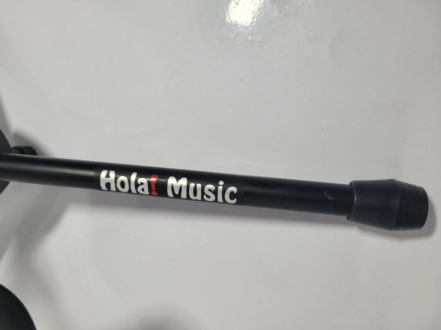 This is a black "Hola! Music" guitar stand. It has an adjustable height and designed to hold various types of guitars securely. The stand features padded contact points to protect your instrument.