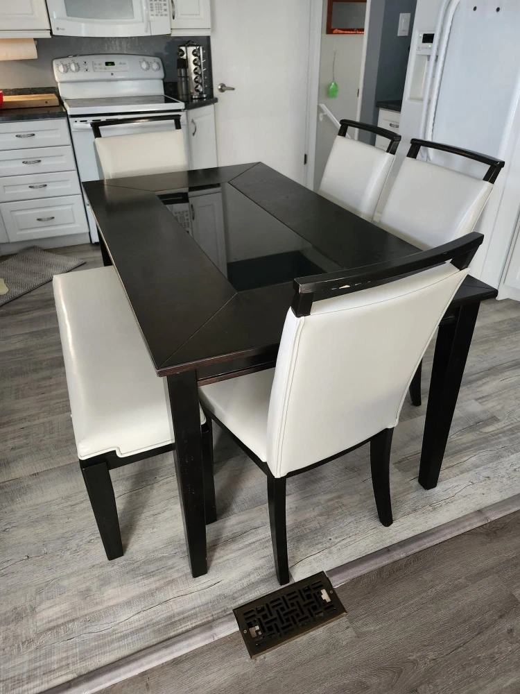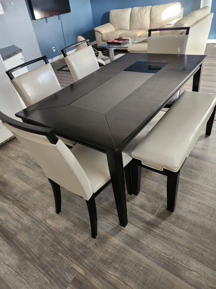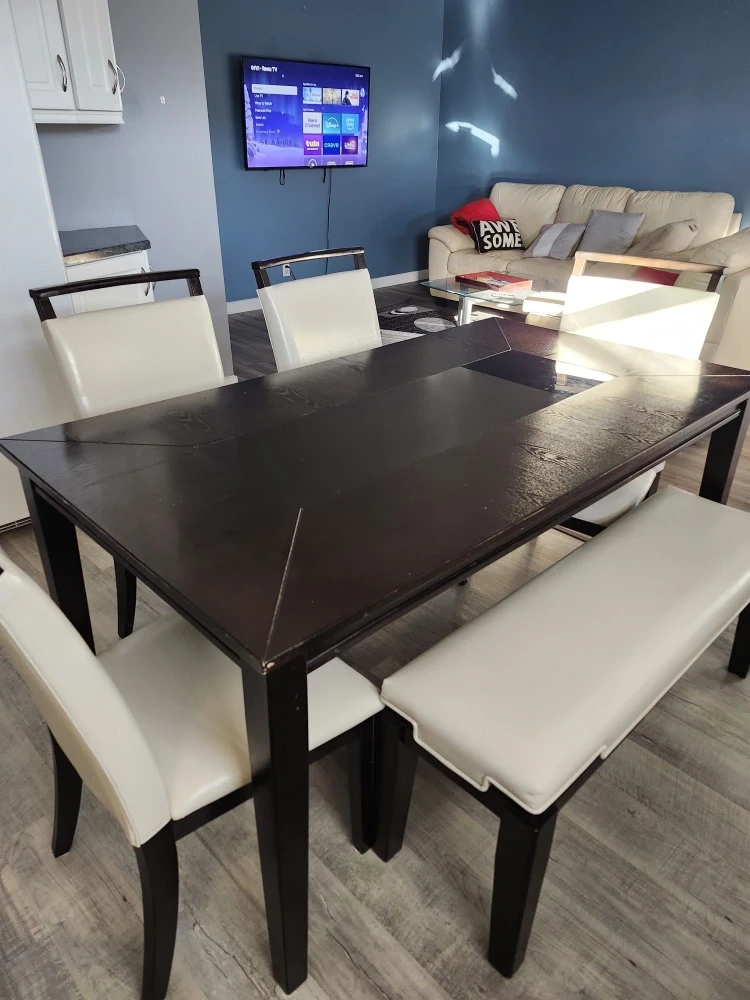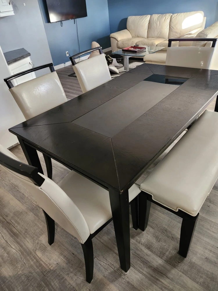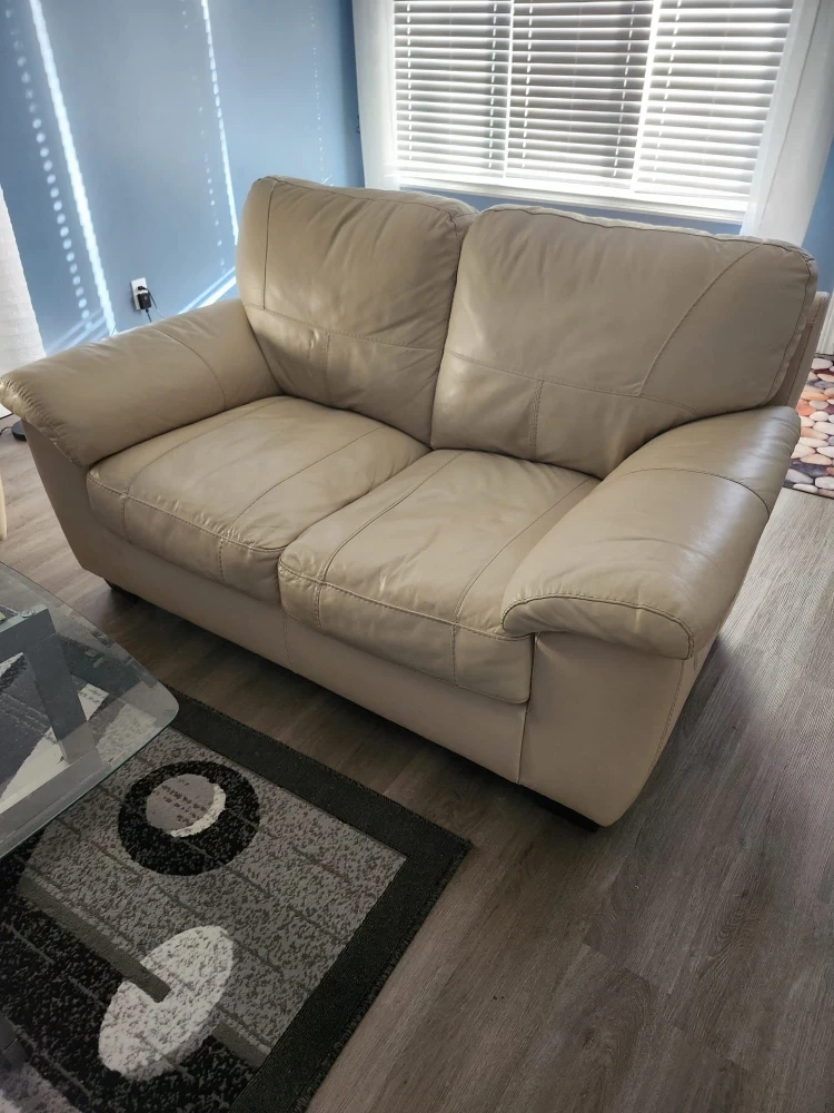 Comfortable cream leather sofa, loveseat and matching dining room set for 6. In excellent condition. The material is real (not bonded) leather. This matching set would be a nice addition to any home!