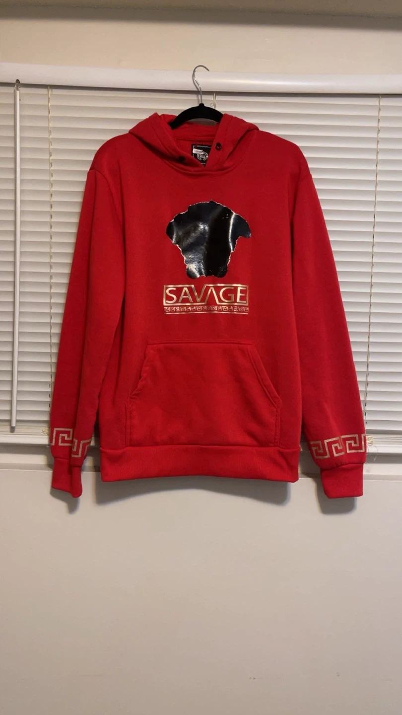 This is a red SAVAGE hoodie with a distinctive Medusa-style graphic on the front. It features a convenient front pocket and decorative Greek key patterns on the sleeves. This pullover style is great for casual wear.