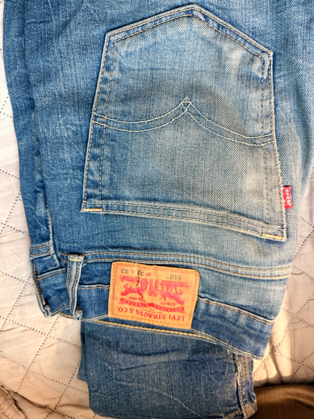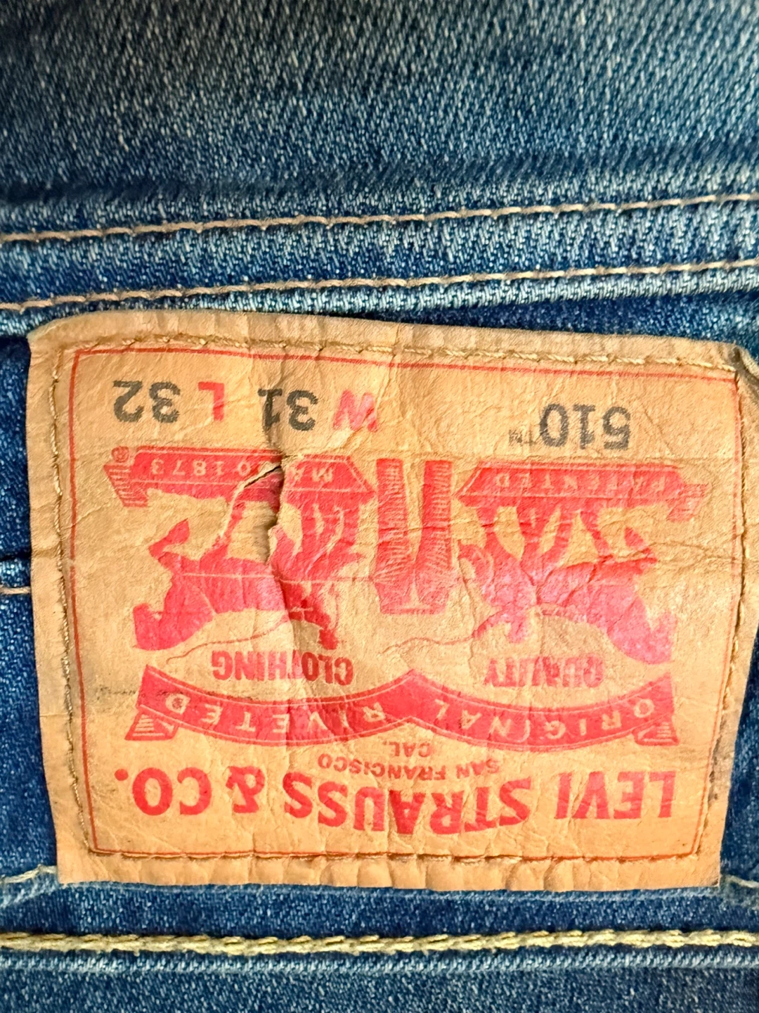 These are Levi's 510 jeans. Waist size 31 inches, inseam 32 inches. Made with denim.