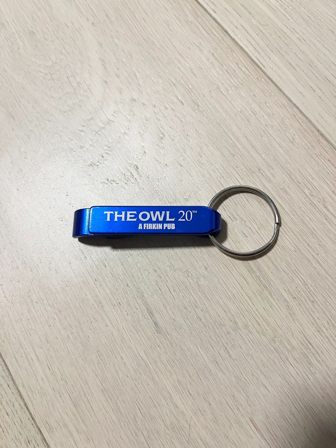 Keychain bottle opener with The Owl and Firkin branding on it. Have so many bottle openers and trying to declutter!