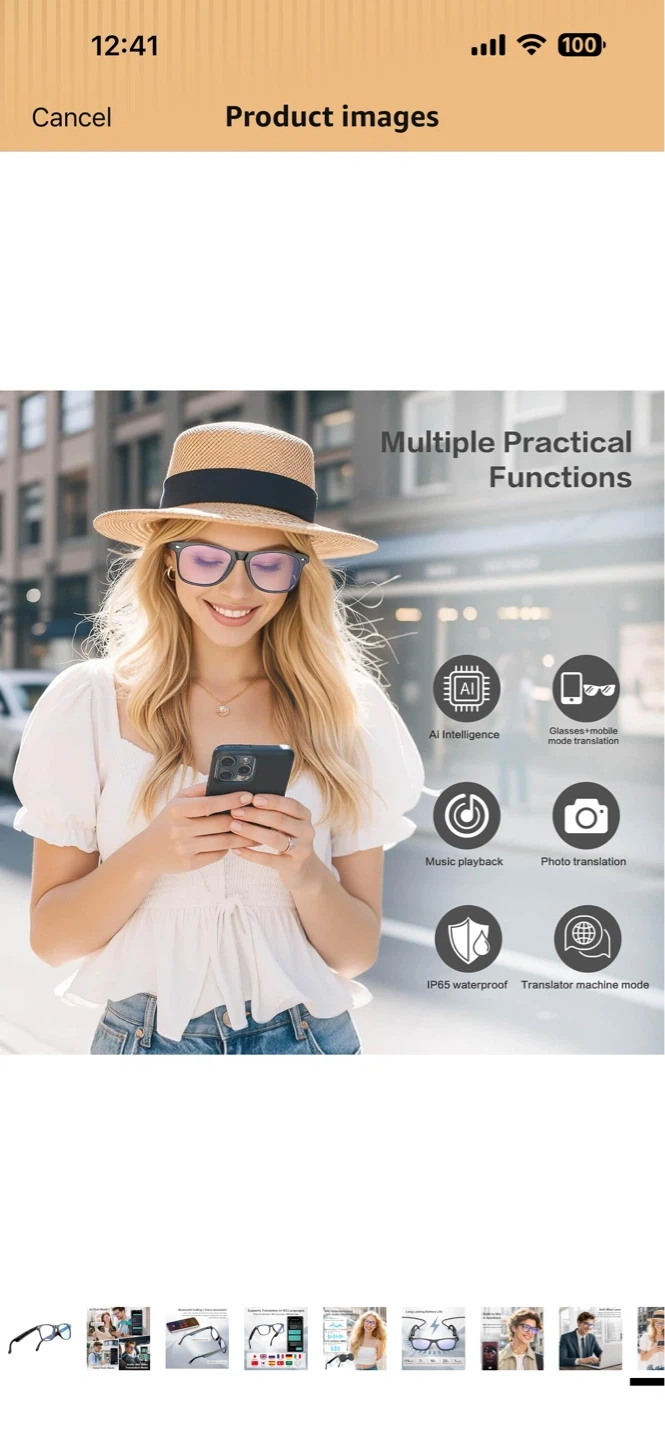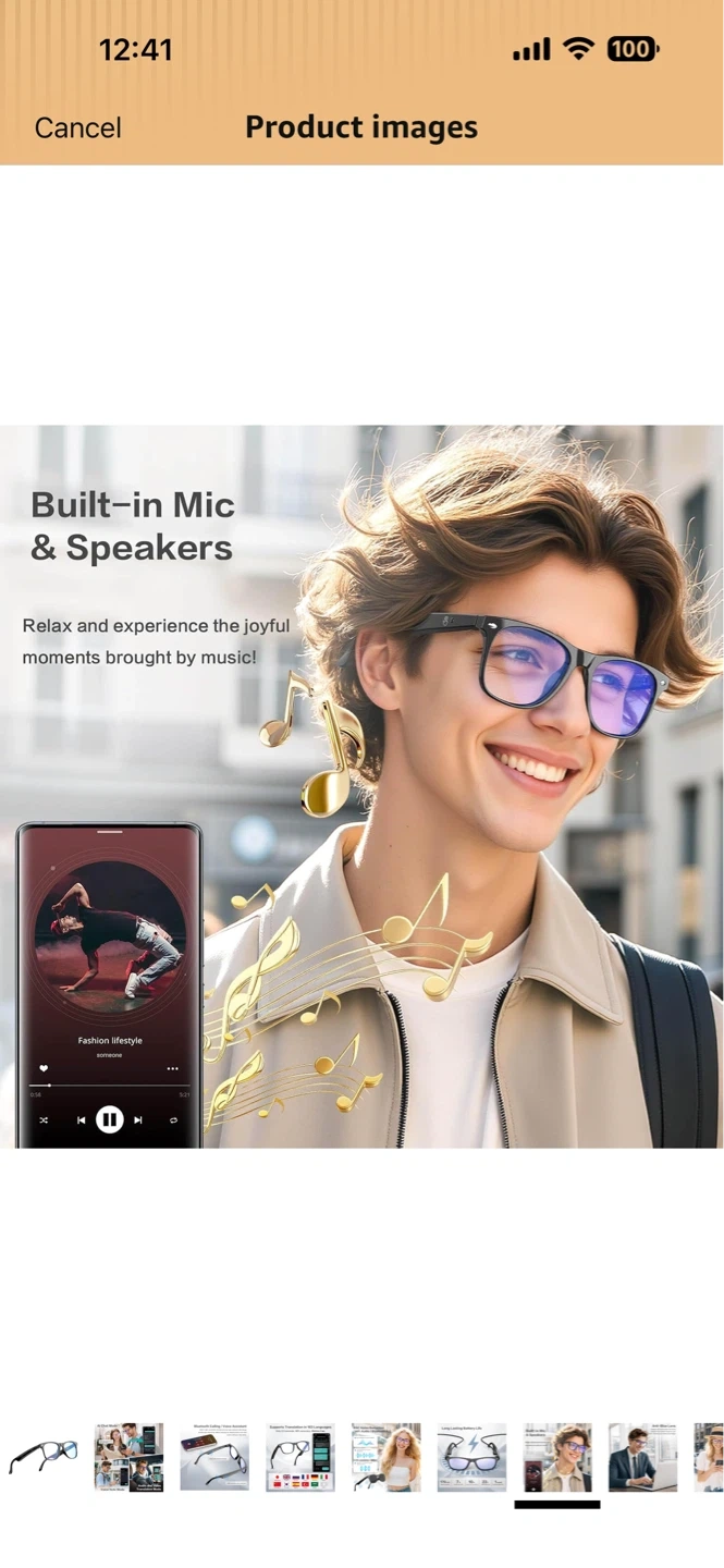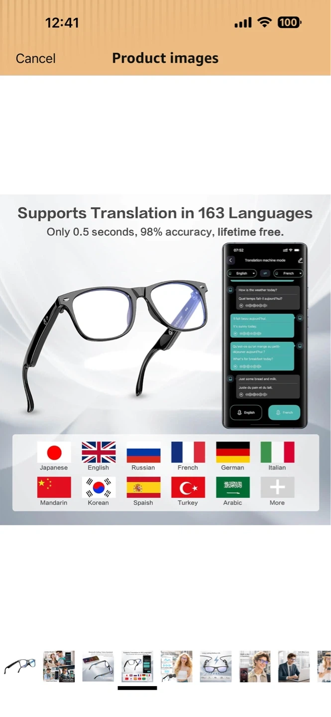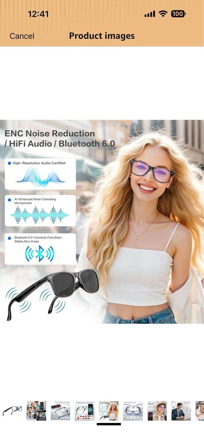 These smart glasses offer ENC noise reduction and HiFi audio with Bluetooth 6.0 connectivity. They support translation in 163 languages with 98% accuracy and have AI chat, voice note, and audio/video translation modes. Features built-in high-sensitivity microphones for clear calls and voice assistant control.