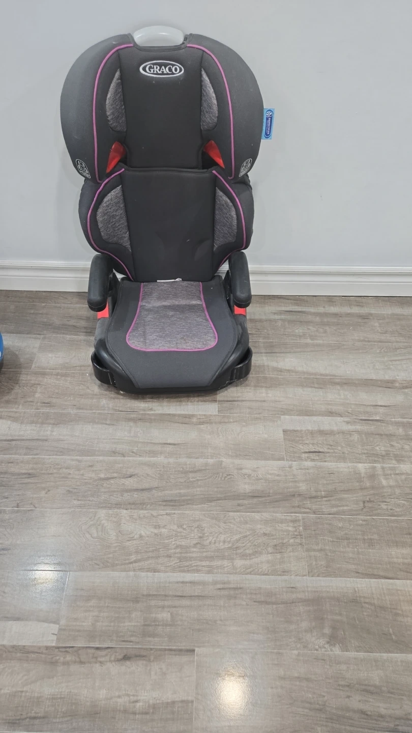 This is a Graco booster car seat in black with pink accents. It's designed for comfort and safety during car rides. It offers a secure fit for children as they grow.