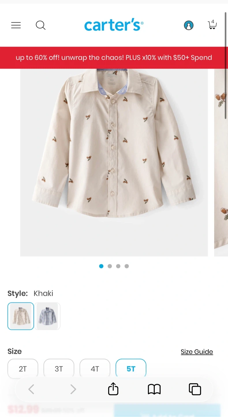 Selling two brand new with tags shirts for toddlers, size 5T! One is a Carter's ivory shirt with a cute print, and the other is an OshKosh khaki shirt with a subtle pattern. Both are long-sleeved and perfect for your little one!