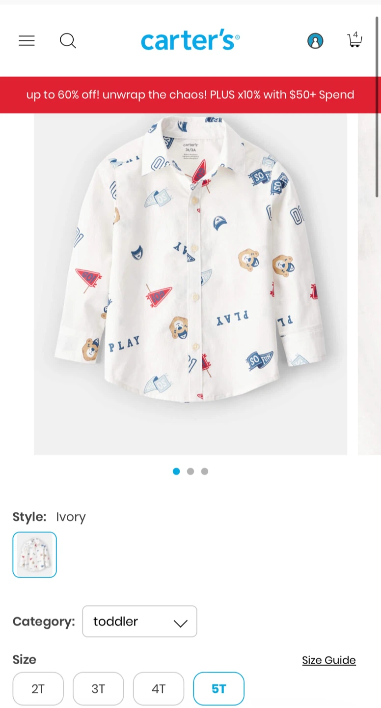 Selling two brand new with tags shirts for toddlers, size 5T! One is a Carter's ivory shirt with a cute print, and the other is an OshKosh khaki shirt with a subtle pattern. Both are long-sleeved and perfect for your little one!
