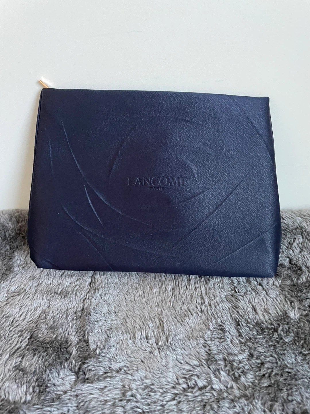 A navy blue cosmetic bag by Lancôme. It features embossed detailing and a zipper closure. This bag is useful for organizing makeup and toiletries.