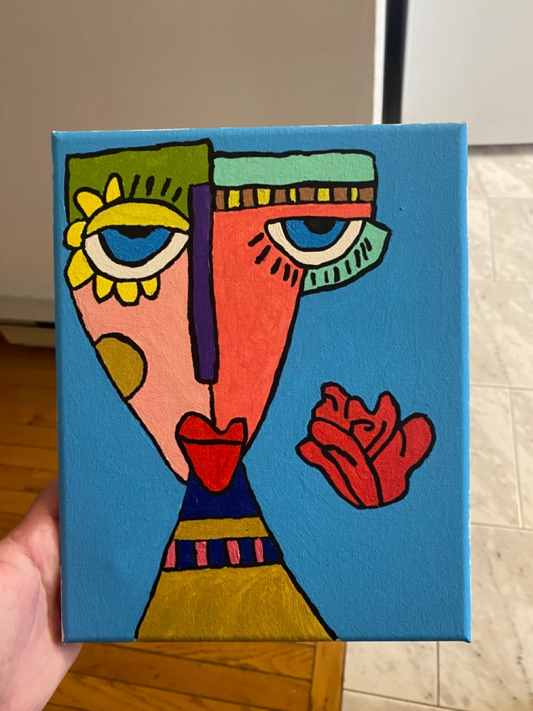 This is a colourful abstract painting of a face on a canvas. It features bold lines and vibrant colours. The painting's dimensions are approximately 8x10 inches.