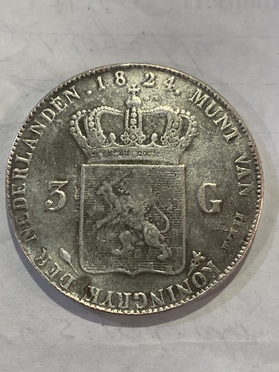 This is a 1824 silver Dutch 3 Guilder coin featuring King Willem I. The coin is silver and has a diameter of approximately 4.5 cm. It's a historical piece for collectors.