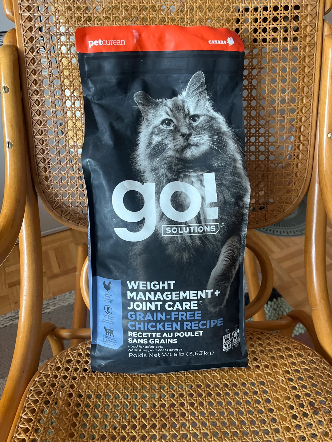 go! SOLUTIONS Weight Management+ Joint Care Grain-Free Chicken Recipe cat food for adults. 8 lb/3.63 kg bag.