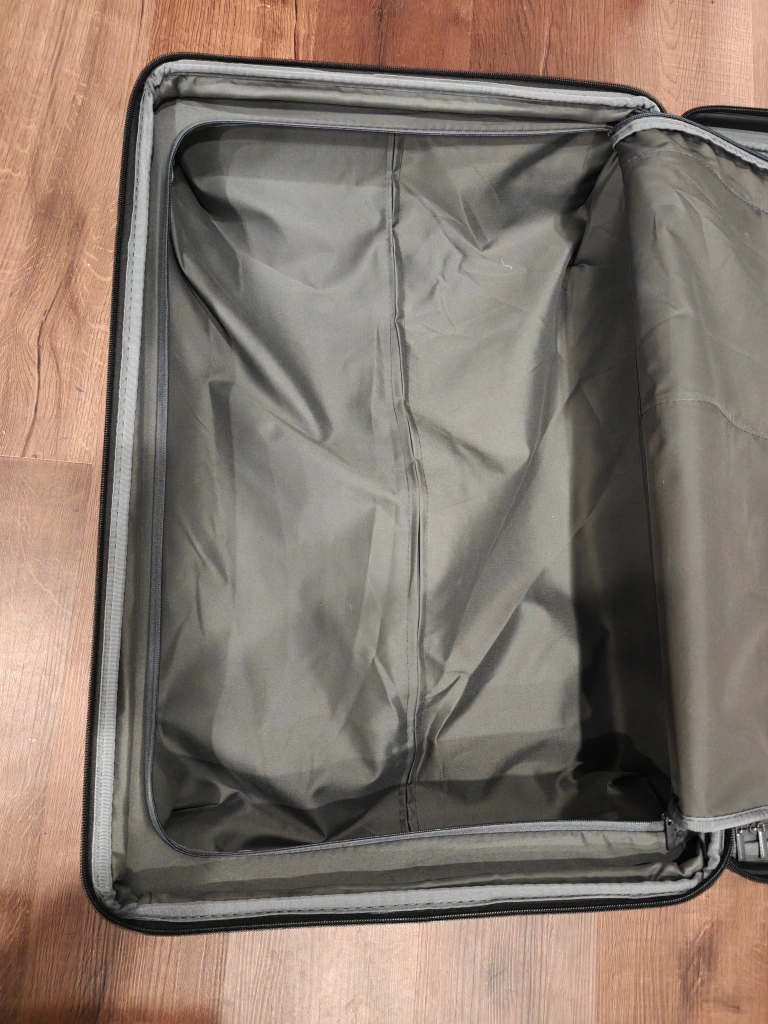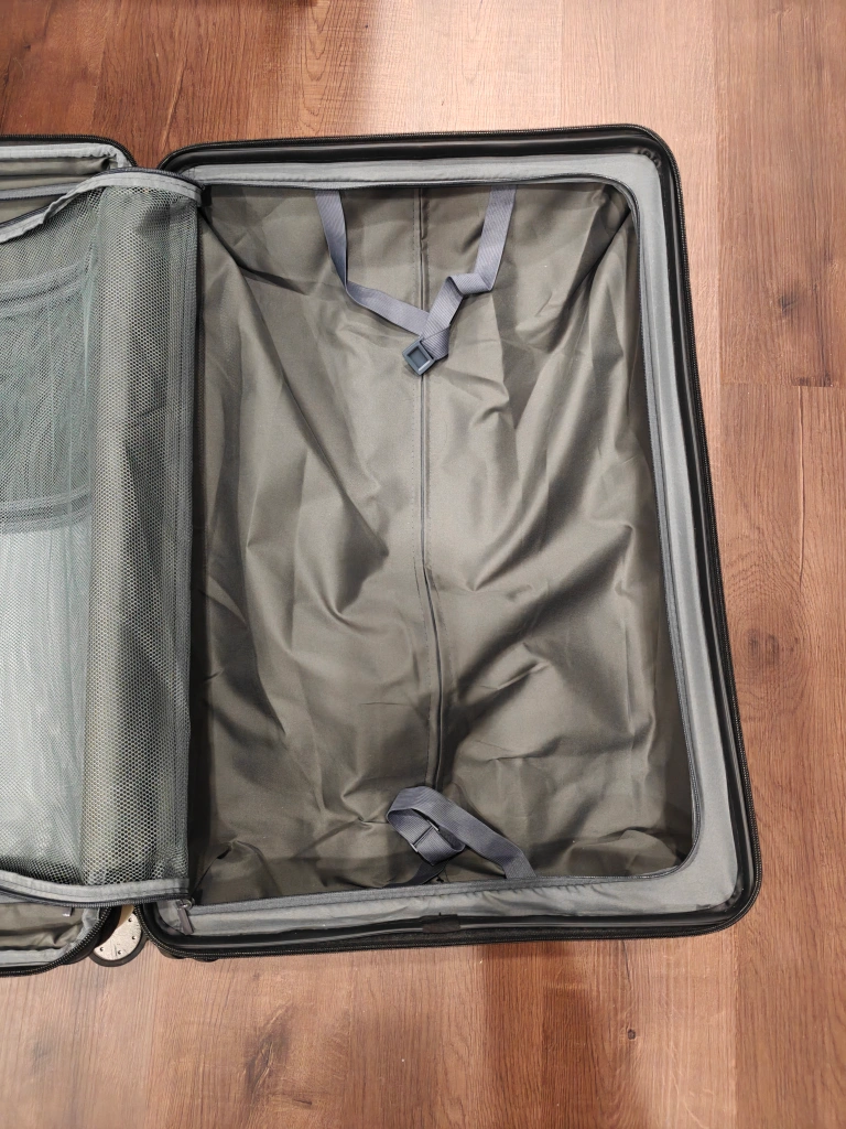 This cream hardshell spinner suitcase has a textured exterior with four wheels for easy manoeuvring. It features a spacious main compartment with securing straps and a zippered mesh pocket on the lid. It is expandable from 80L to 100L of capacity. An additional zippered compartment is present on the inside lid for better organization.