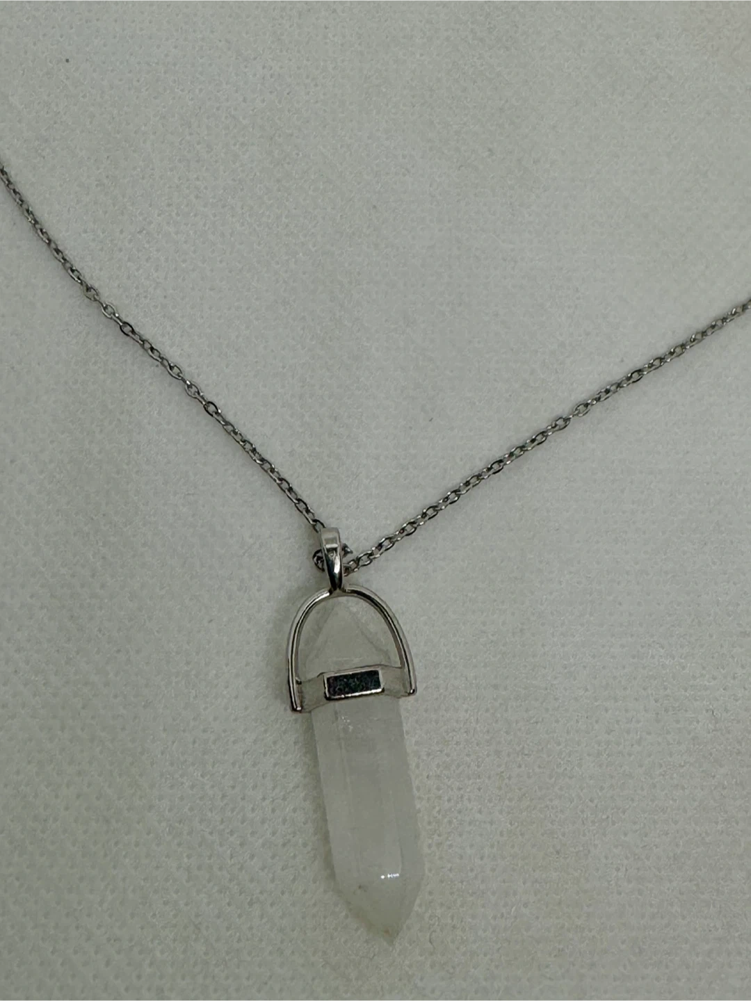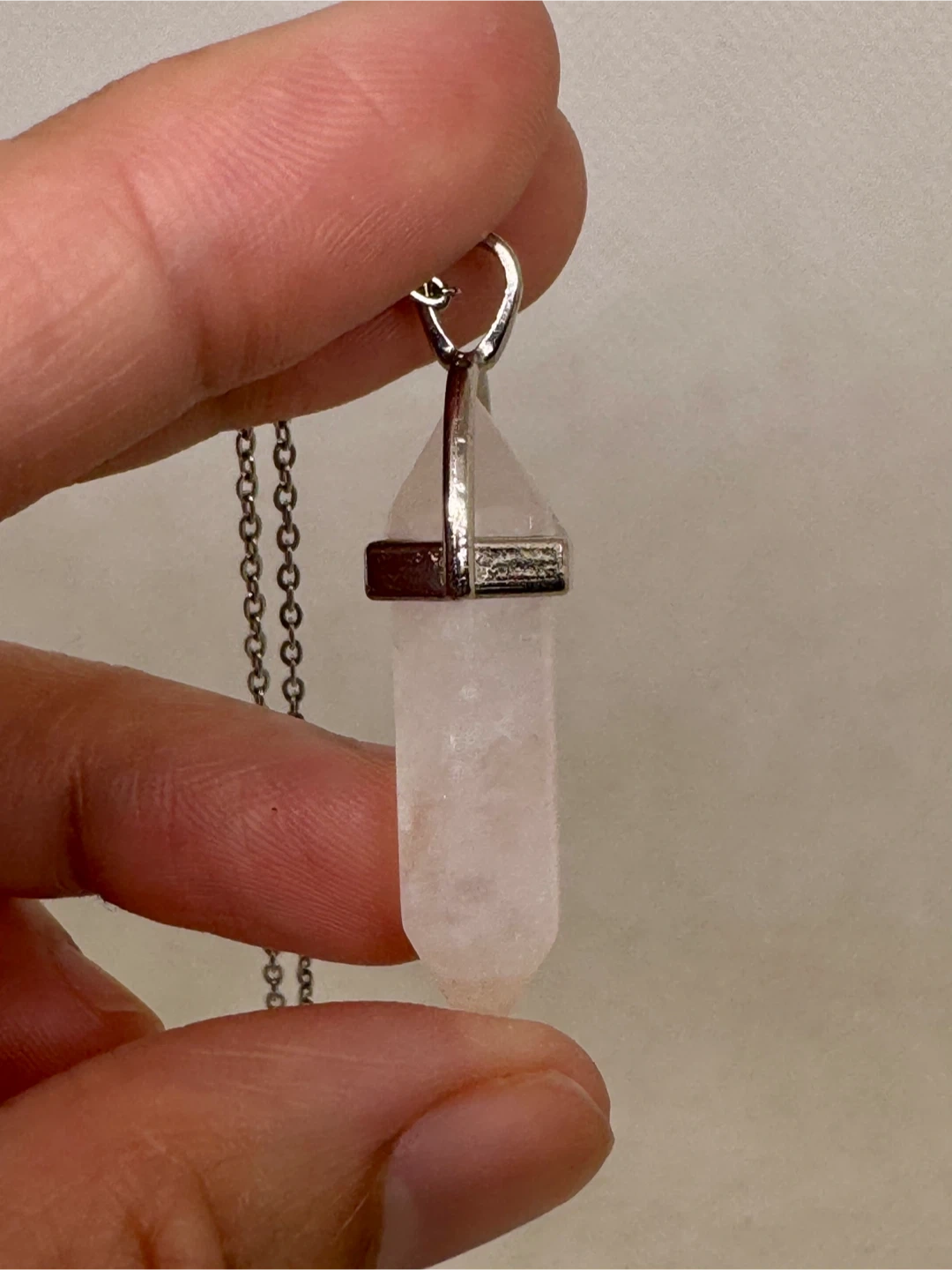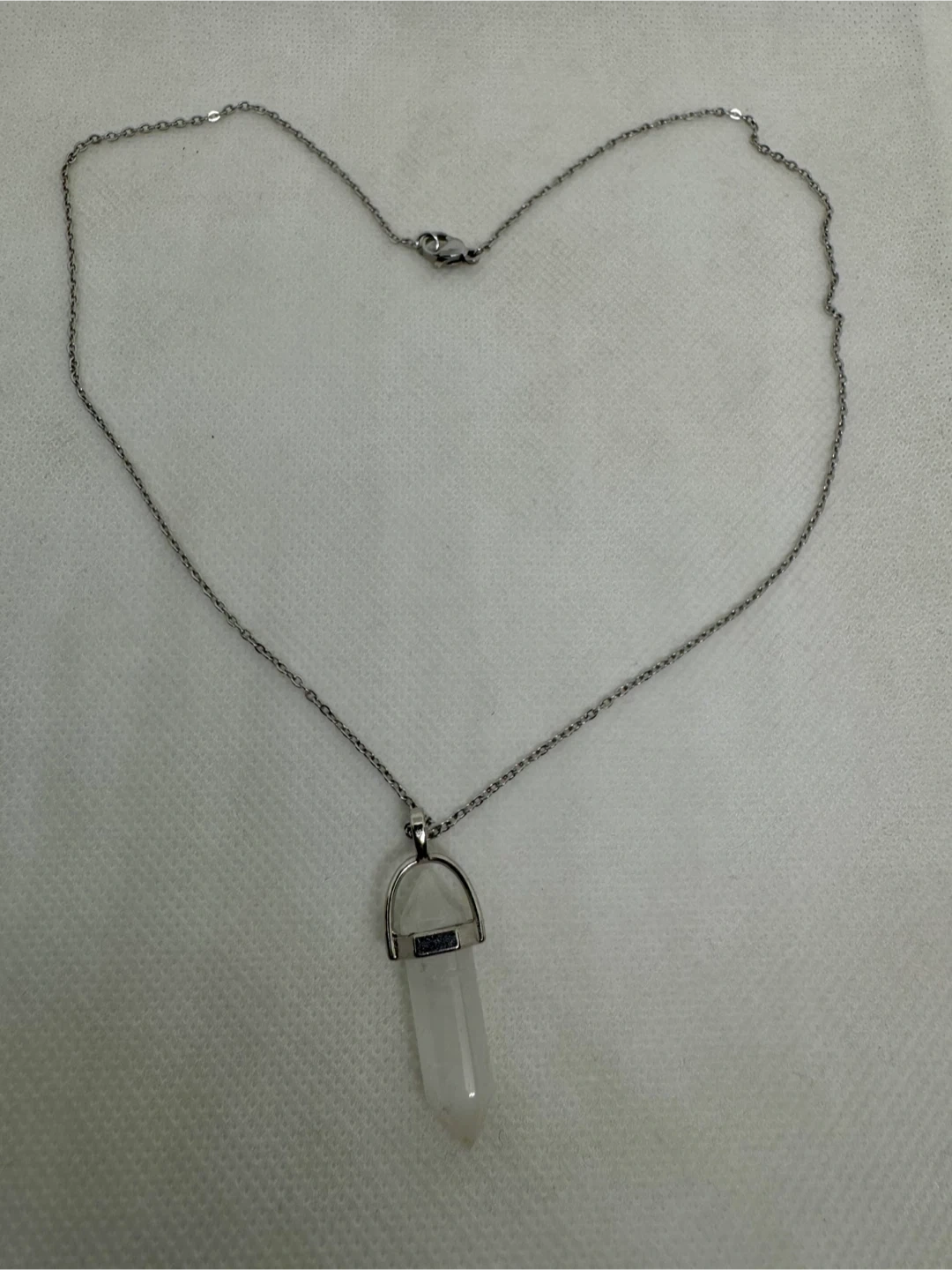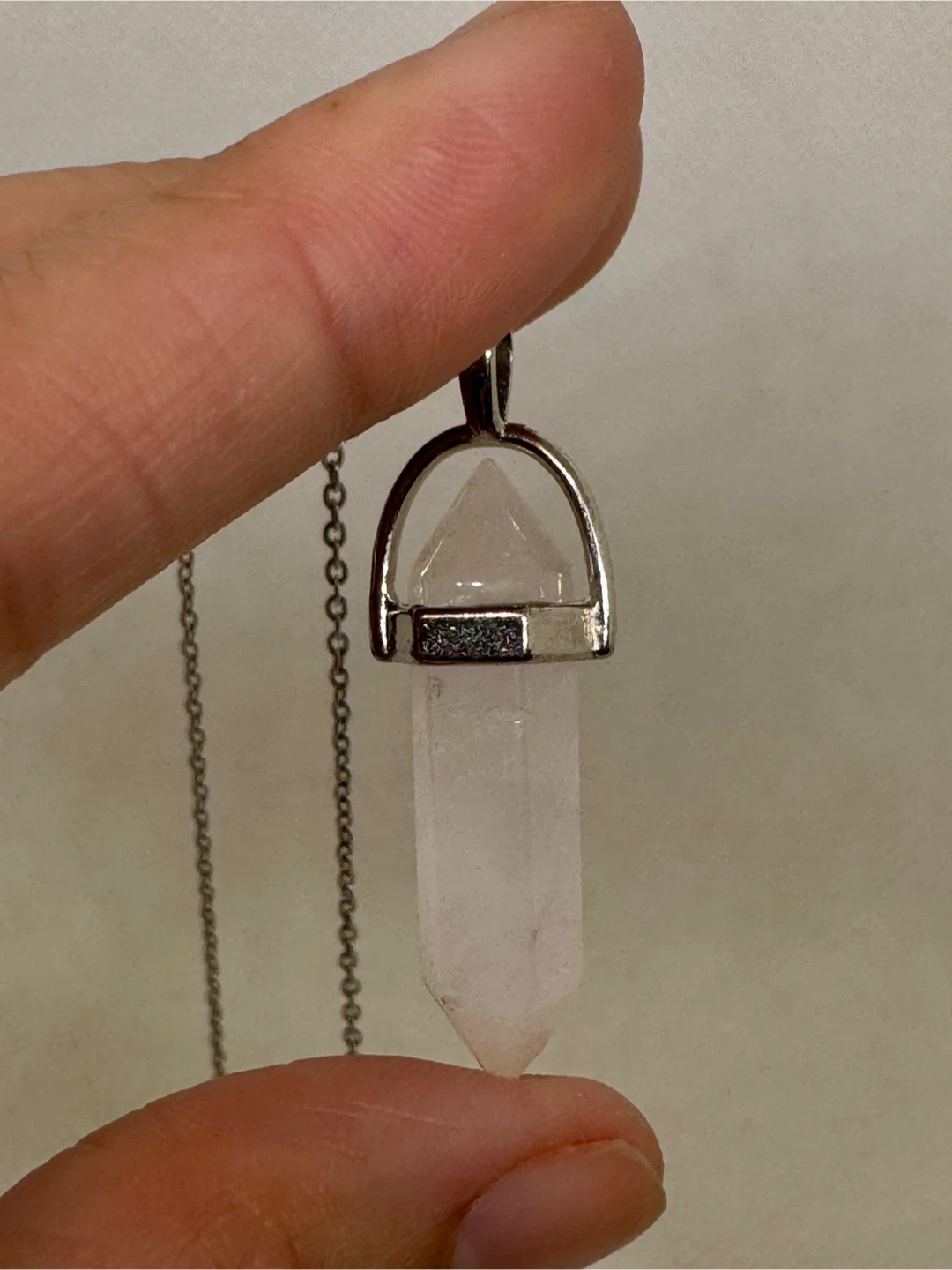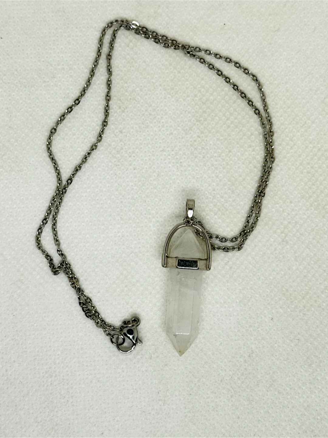 This is a clear quartz crystal pendant necklace with a silver-toned chain. The pendant is a clear, faceted double crystal point. It's a simple and elegant accessory.