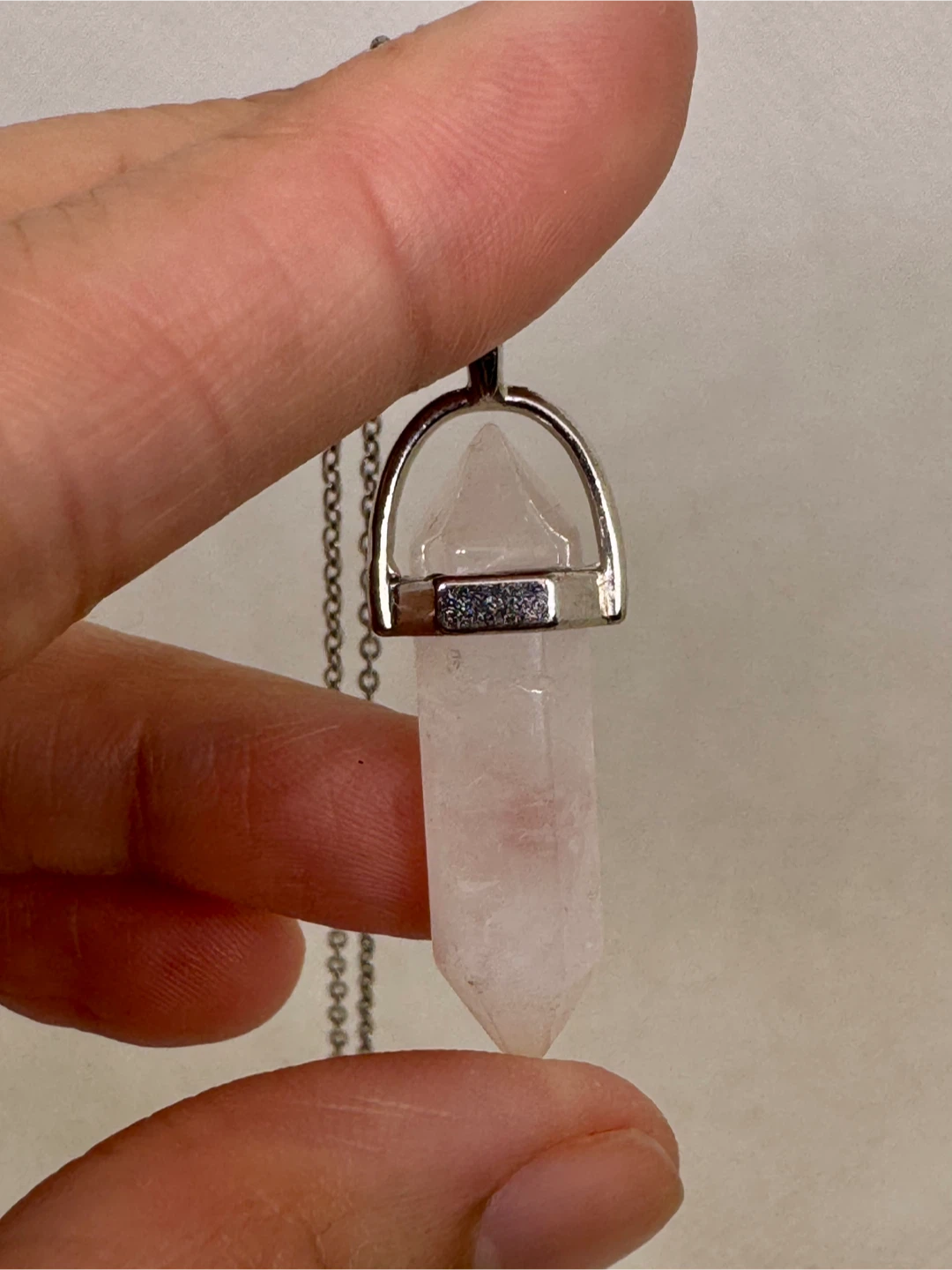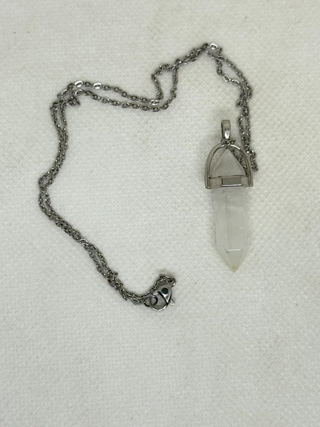 This is a clear quartz crystal pendant necklace with a silver-toned chain. The pendant is a clear, faceted double crystal point. It's a simple and elegant accessory.