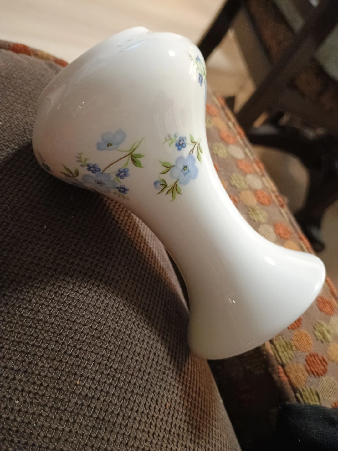 White vase with a blue floral pattern.English Bone china material. Made in England. It's a charming piece for display!