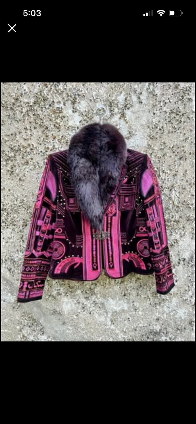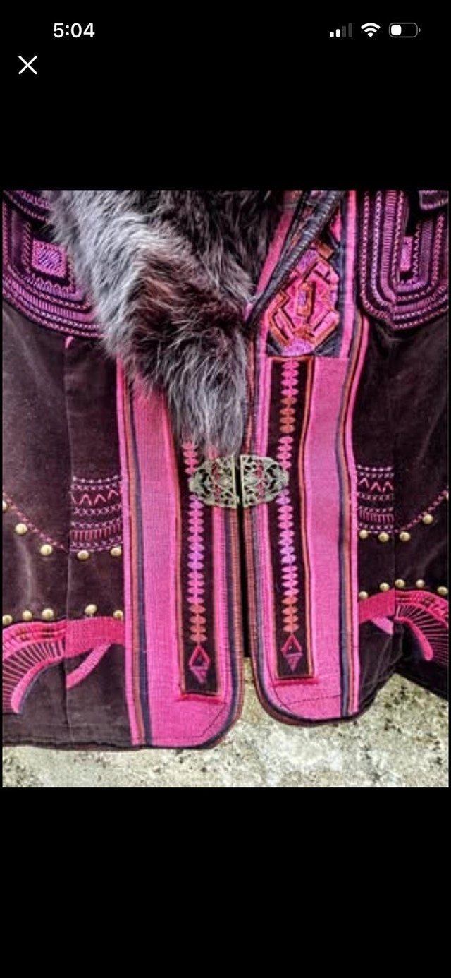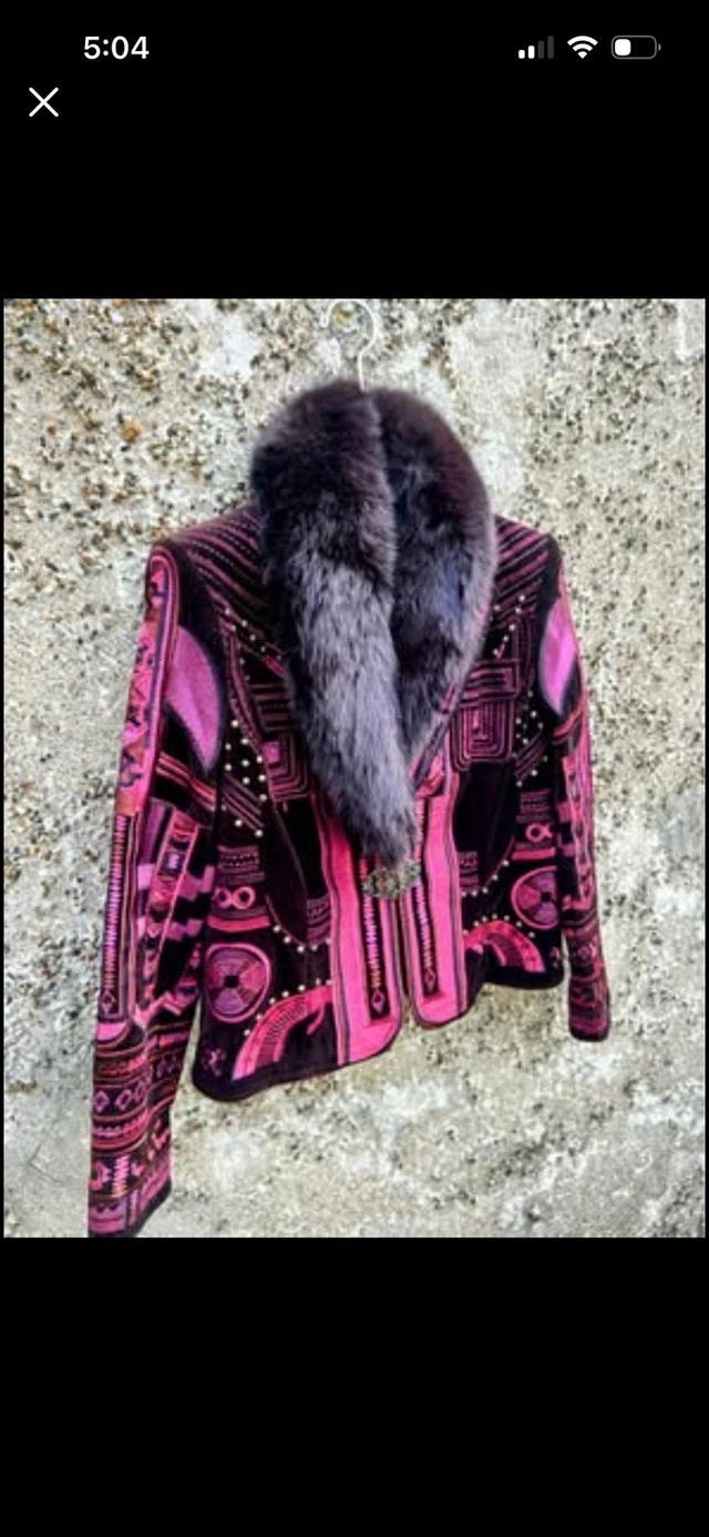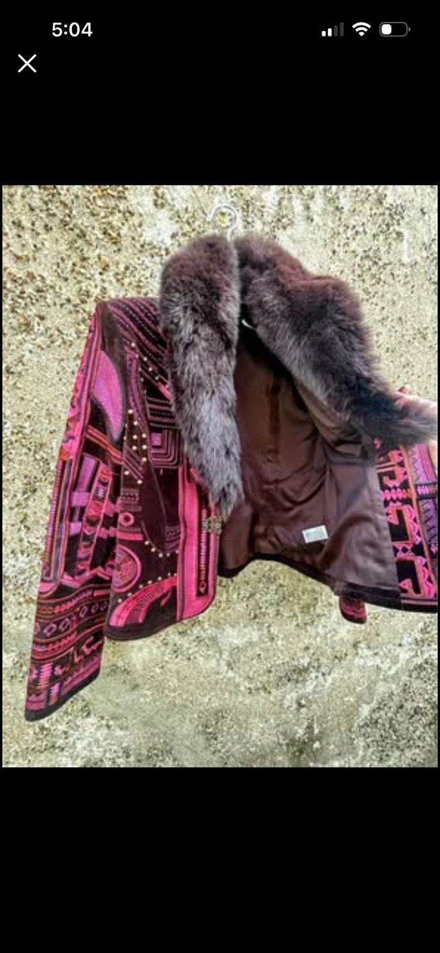 I'm selling a Peter Nygard velvet coat that features a stunning faux fur collar and unique detailing, making it a standout piece. This coat is in excellent condition. Brand: Peter Nygard. Material: Velvet with faux fur collar. Closure: Clasp closure. Style: Unique design with intricate details. Note: Clasp has two hooks to close, one hook is broken. If the ad's still up, the coat is still available.