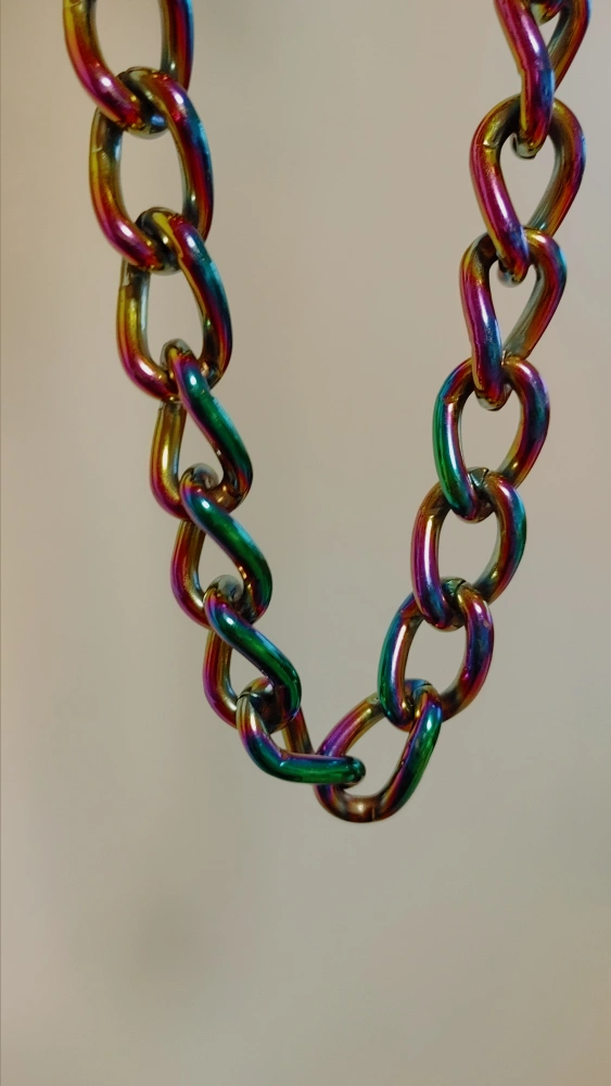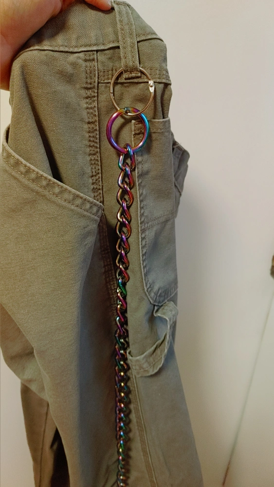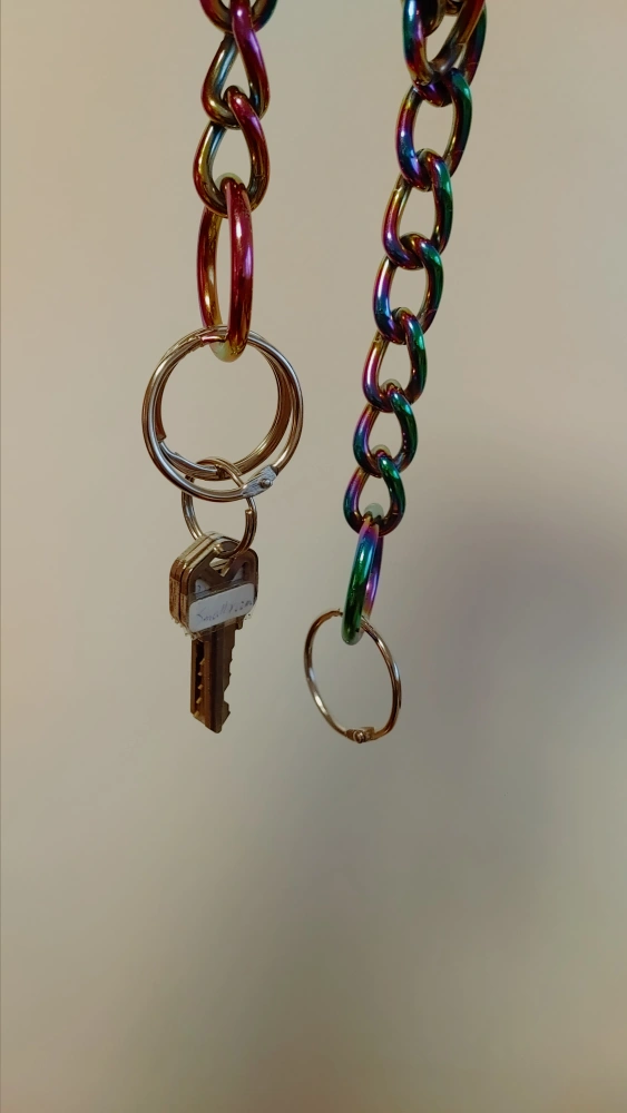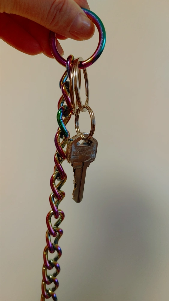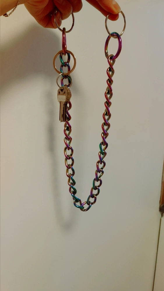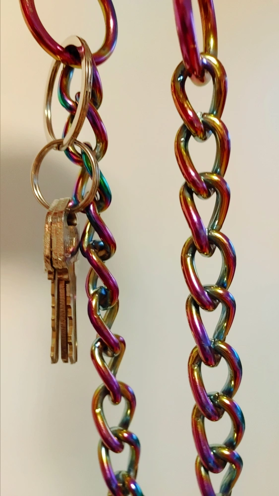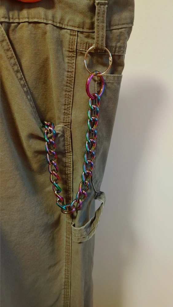 A cool rainbow-coloured chain with clips for your belt loops and keys. It's made of stainless steel and has a unique iridescent finish.