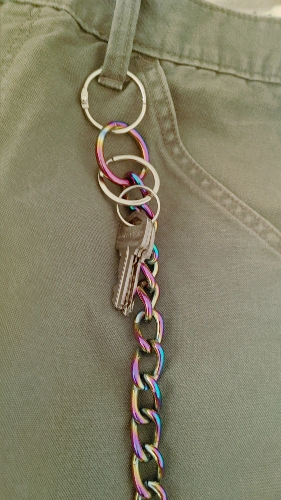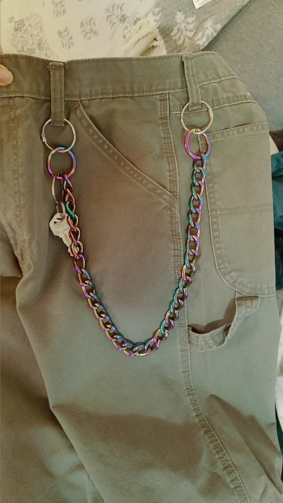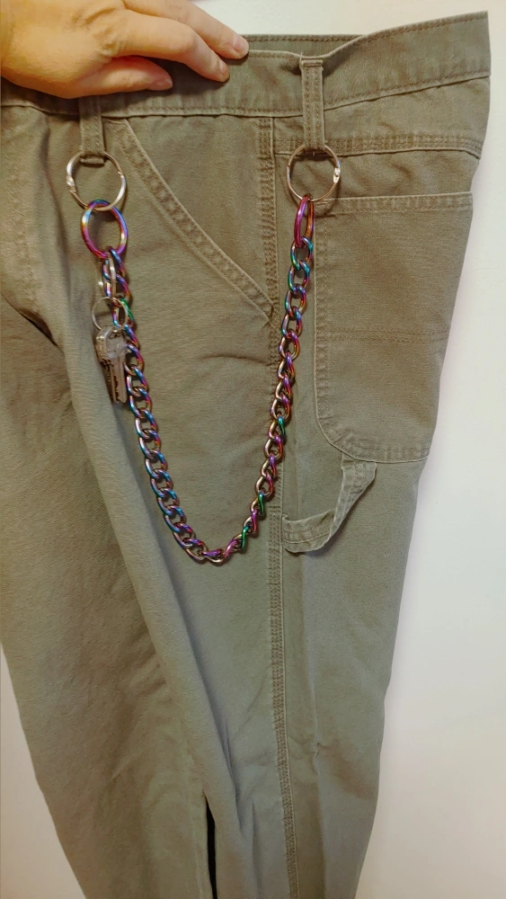 A cool rainbow-coloured chain with clips for your belt loops and keys. It's made of stainless steel and has a unique iridescent finish.