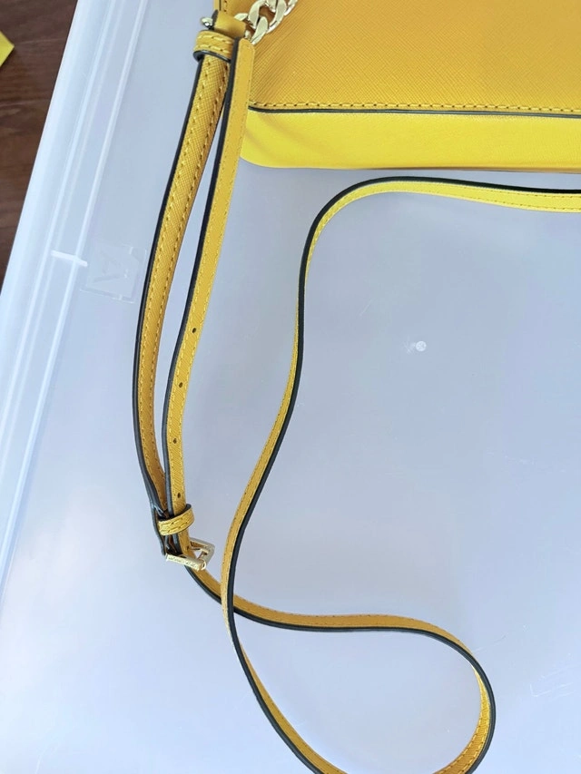 This is a stylish used Michael Kors crossbody bag, perfect for carrying your essentials. Its compact size makes it ideal for everyday use. The bag shows some signs of wear, but it is still in good condition and has plenty of life left. - Brand: Michael Kors - Style: Crossbody - Colour: Yellow - Material: Leather - Dimensions: 9.5 inches in height, 6.5 inches in width Looking for a sunny addition to your wardrobe? This crossbody is ready to brighten your day! And hey, just so we're clear, if you're seeing this ad, the bag is still up for grabs!