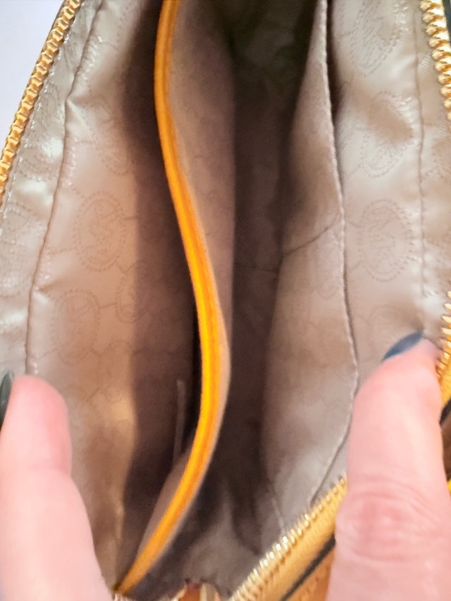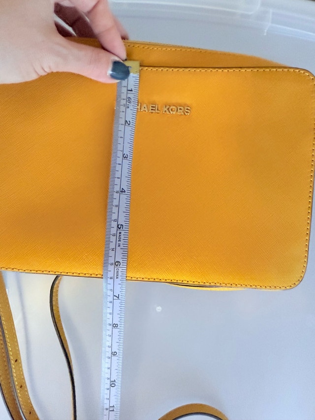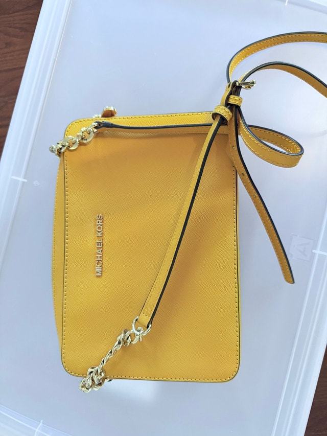 This is a stylish used Michael Kors crossbody bag, perfect for carrying your essentials. Its compact size makes it ideal for everyday use. The bag shows some signs of wear, but it is still in good condition and has plenty of life left. - Brand: Michael Kors - Style: Crossbody - Colour: Yellow - Material: Leather - Dimensions: 9.5 inches in height, 6.5 inches in width Looking for a sunny addition to your wardrobe? This crossbody is ready to brighten your day! And hey, just so we're clear, if you're seeing this ad, the bag is still up for grabs!