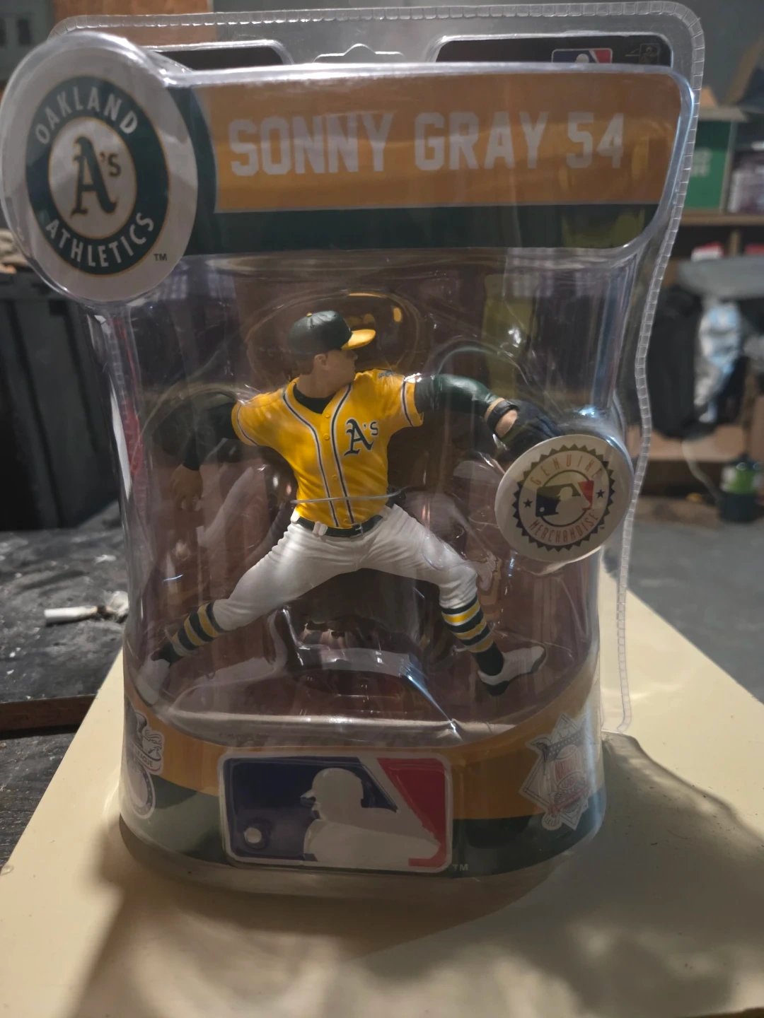 This is a Sonny Gray 54 Oakland Athletics figure. It's a collectible item in its original packaging.