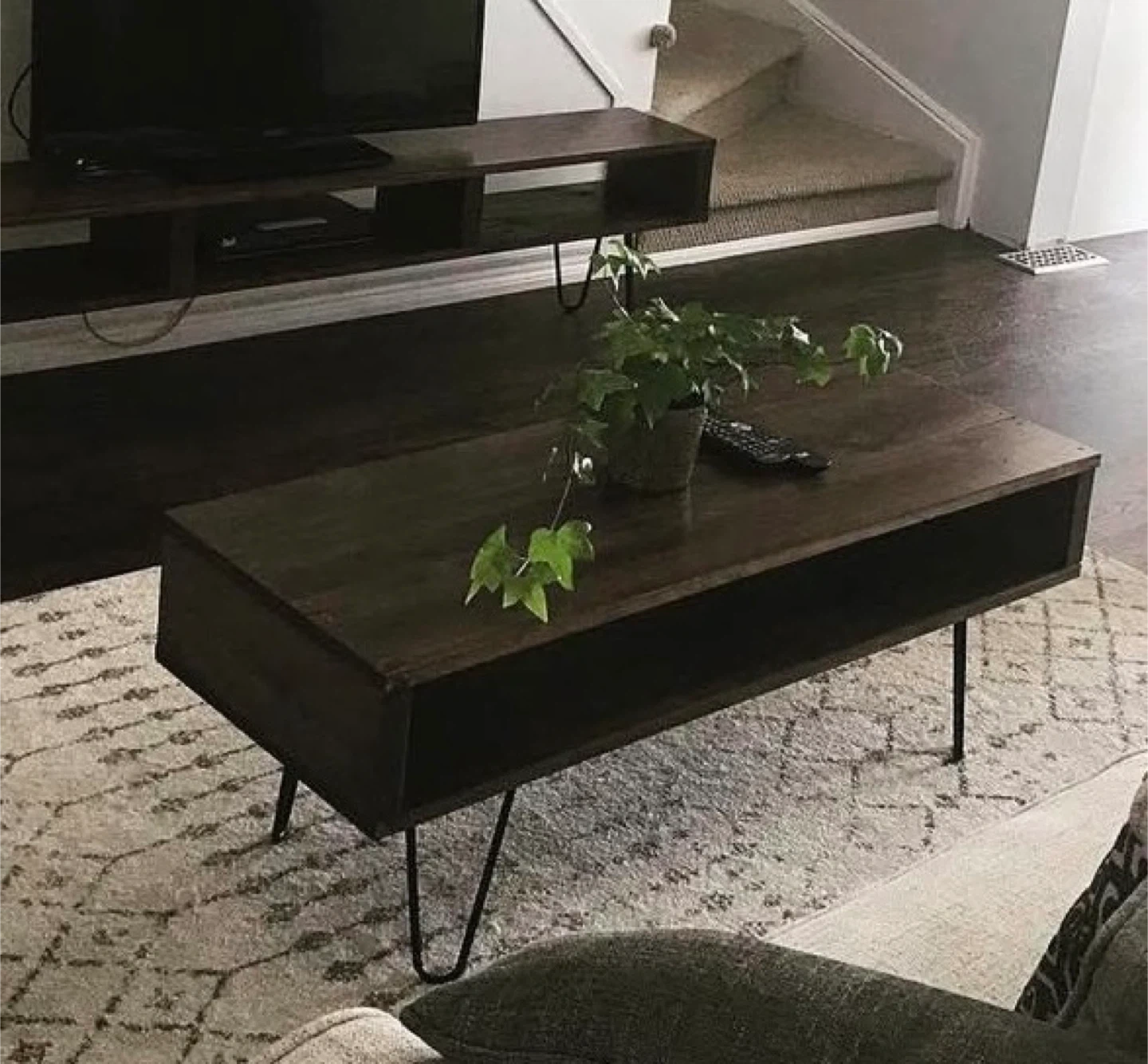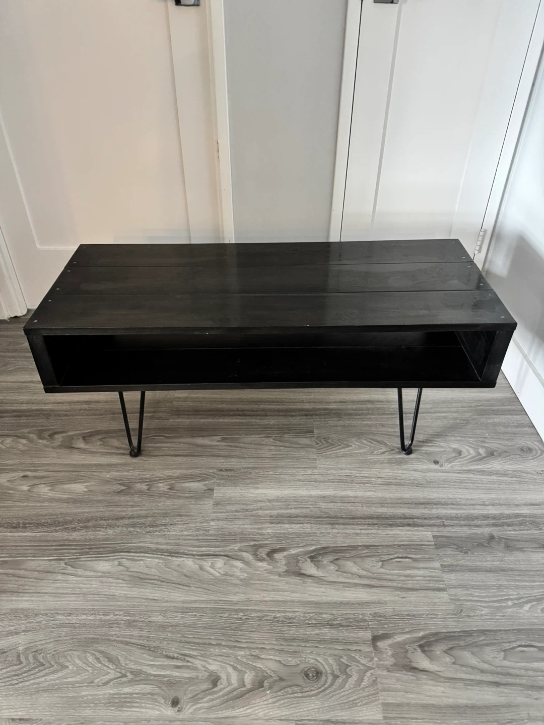 Table is made from Canadian pine and the legs are made from folded steel. Each leg has a floor protector on it at the bottom.