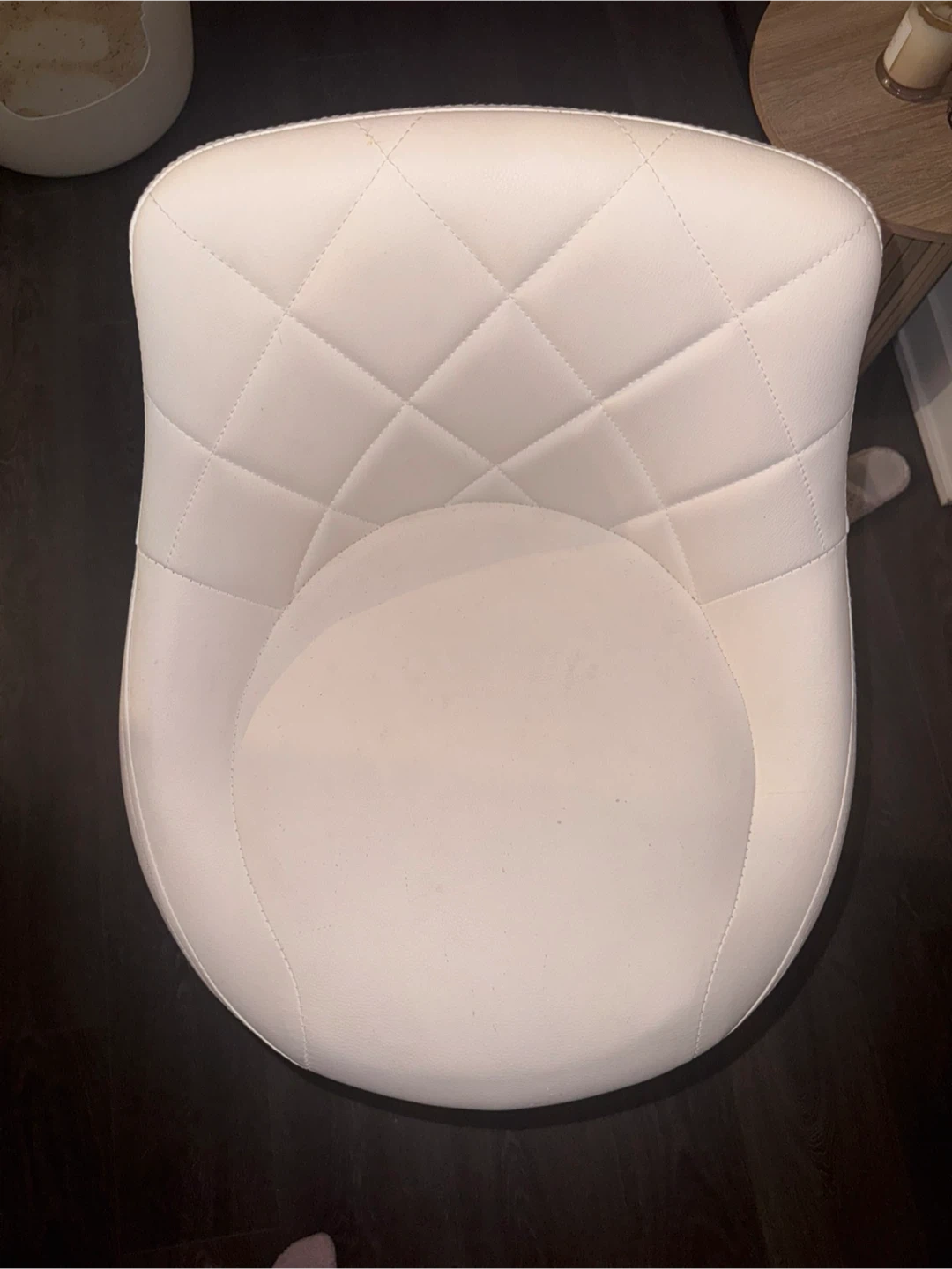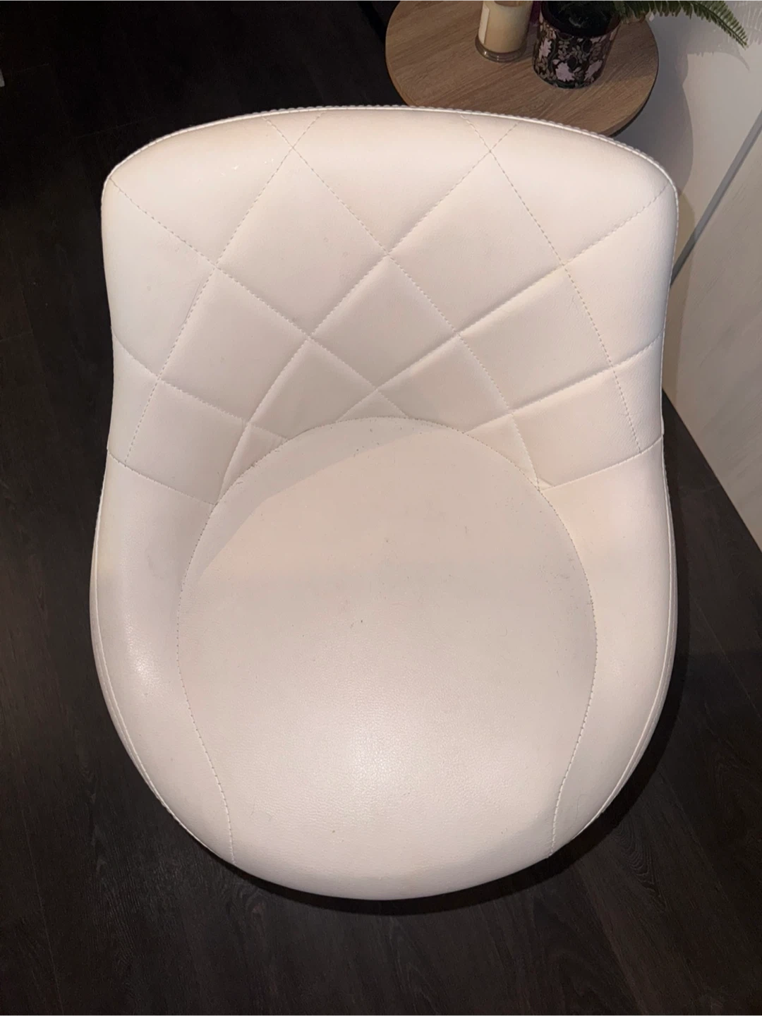 Selling a set of 2 white bar stools with adjustable height. It features a quilted pattern on the seat.