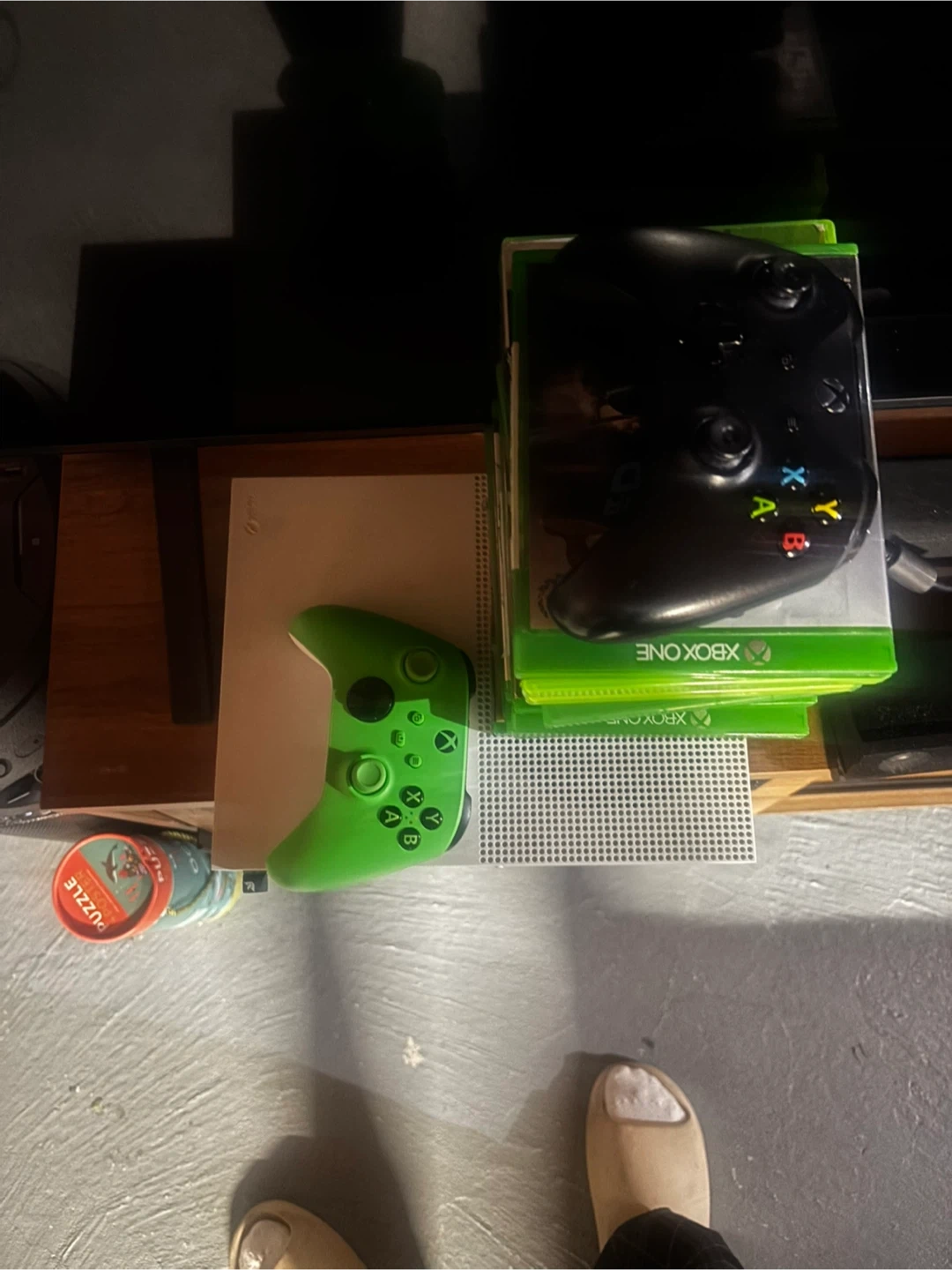 Xbox One S console comes with a stack of games and two controllers. One controller is black and the other is bright green. It's ready for gaming!