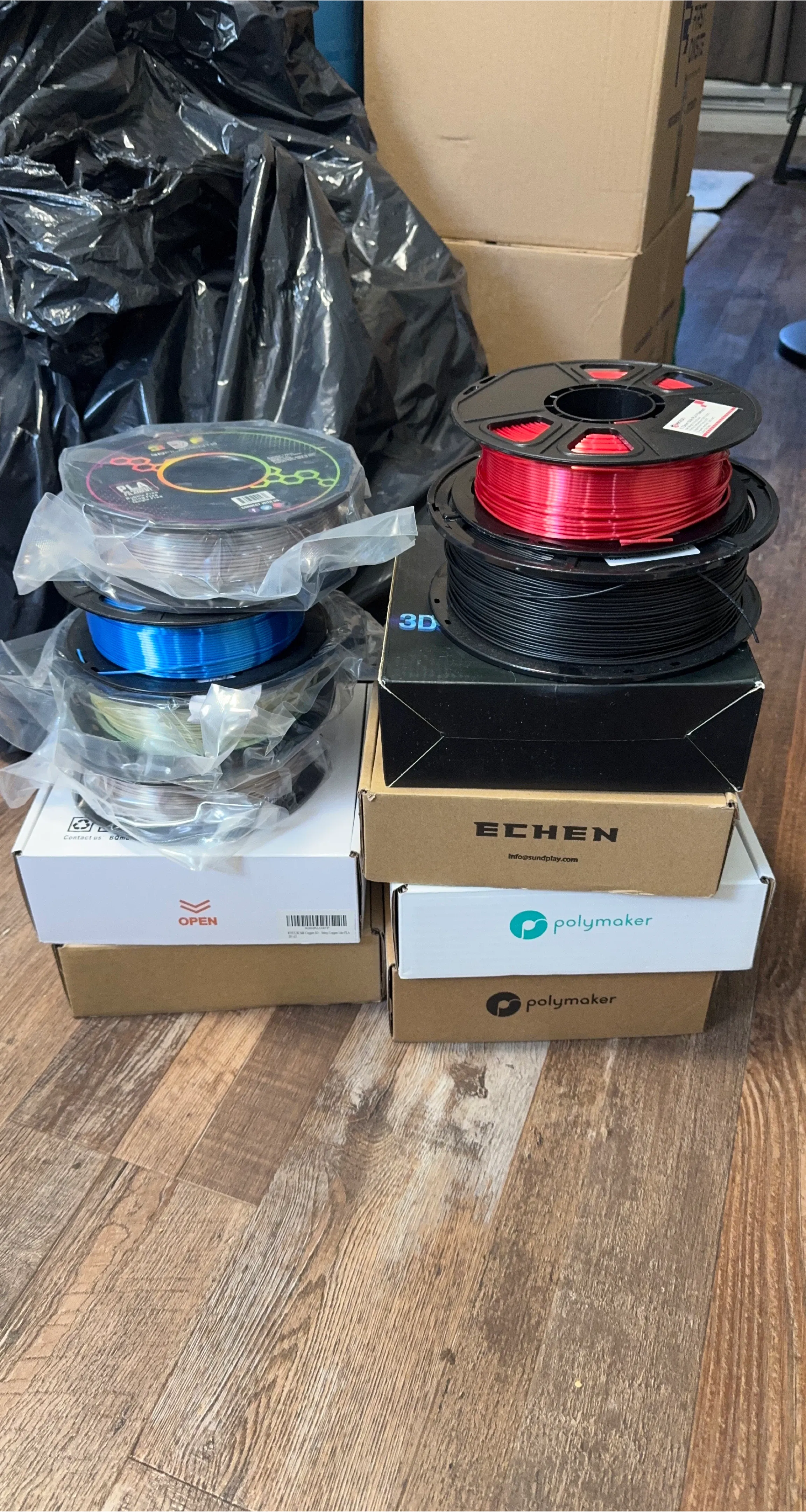 A collection of 3D printer filament spools including Polymaker and Echen brands. Includes colours like red, black, blue, and translucent. These are PLA filaments.