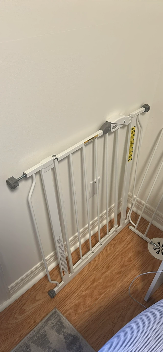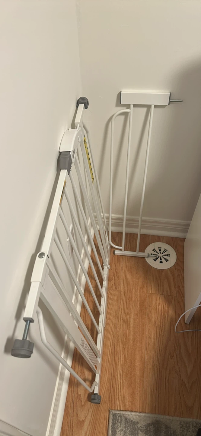 This is a white metal safety gate. It's designed to keep pets and small children out of certain areas. The gate is adjustable for different doorway widths. Perfect condition barely used and pet free home