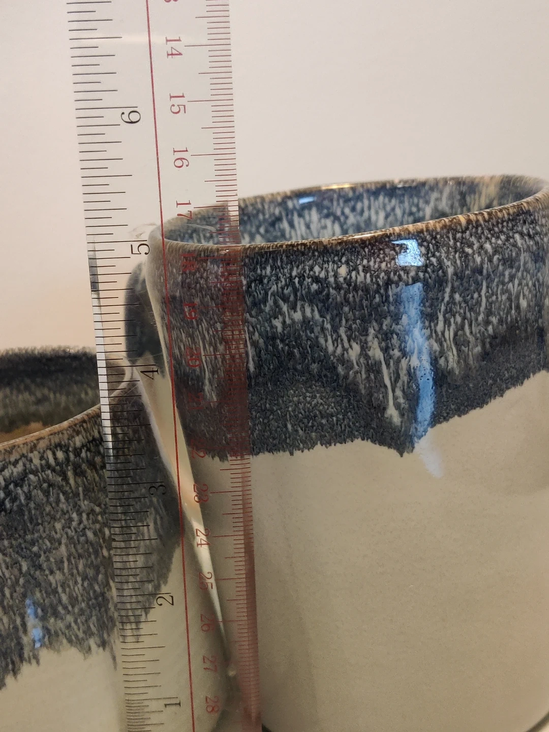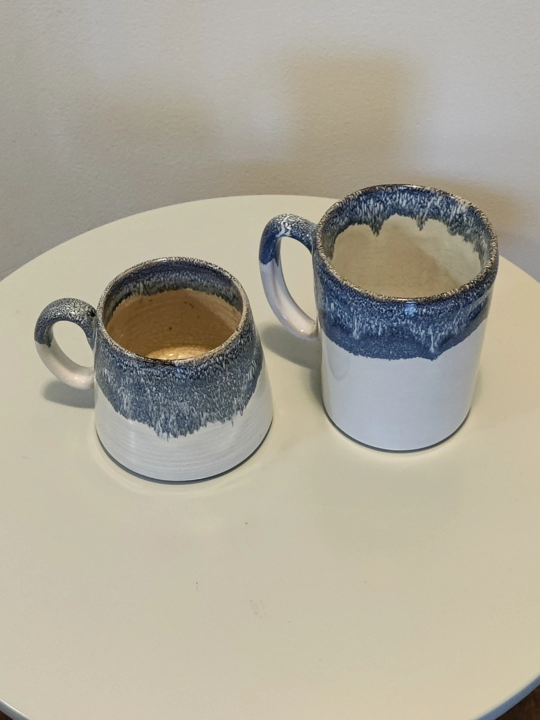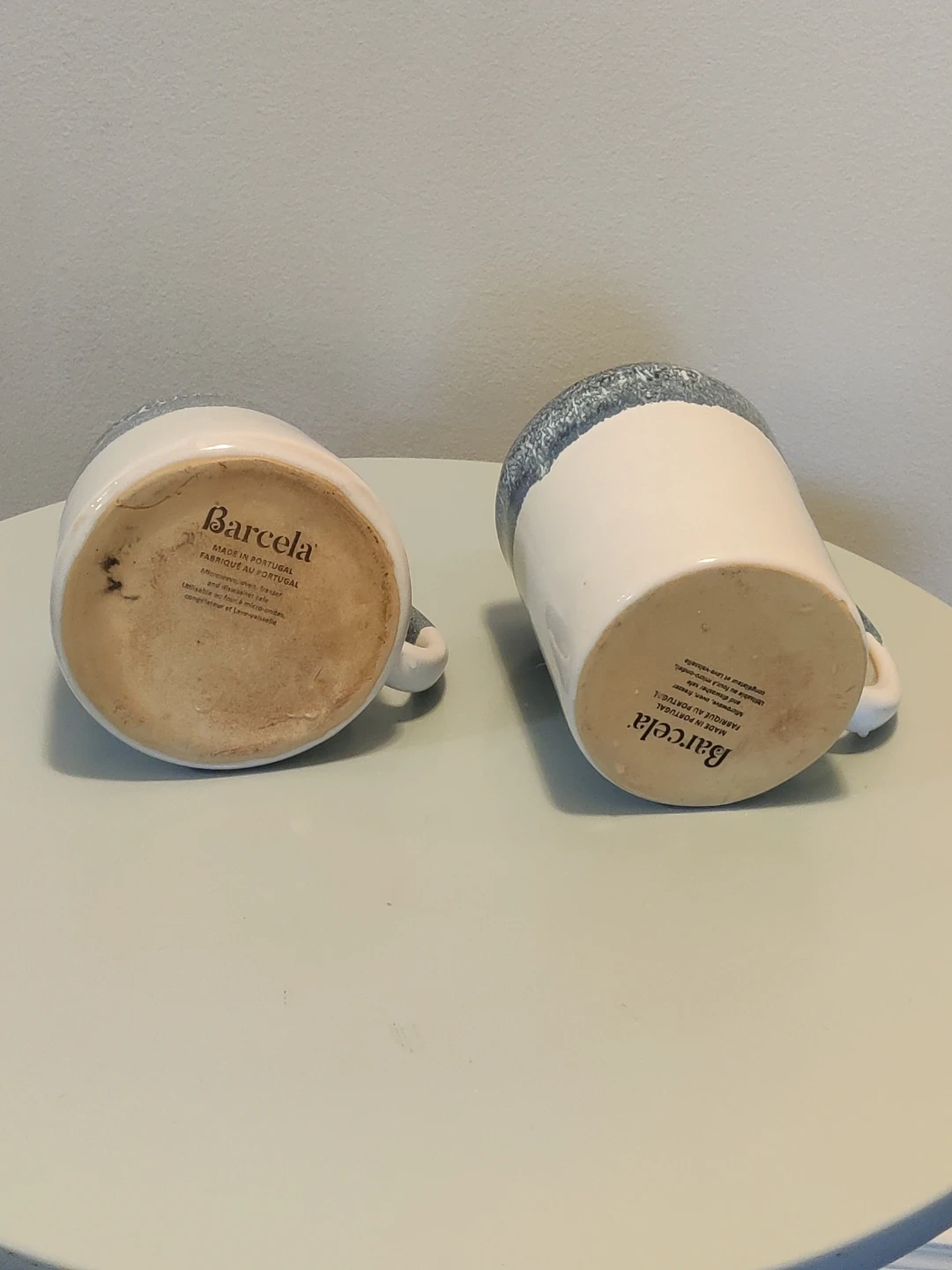 These two ceramic mugs are from Barcela and made in Portugal. They feature a cream base with a blue speckled glaze around the rim. Dishwasher and microwave safe.