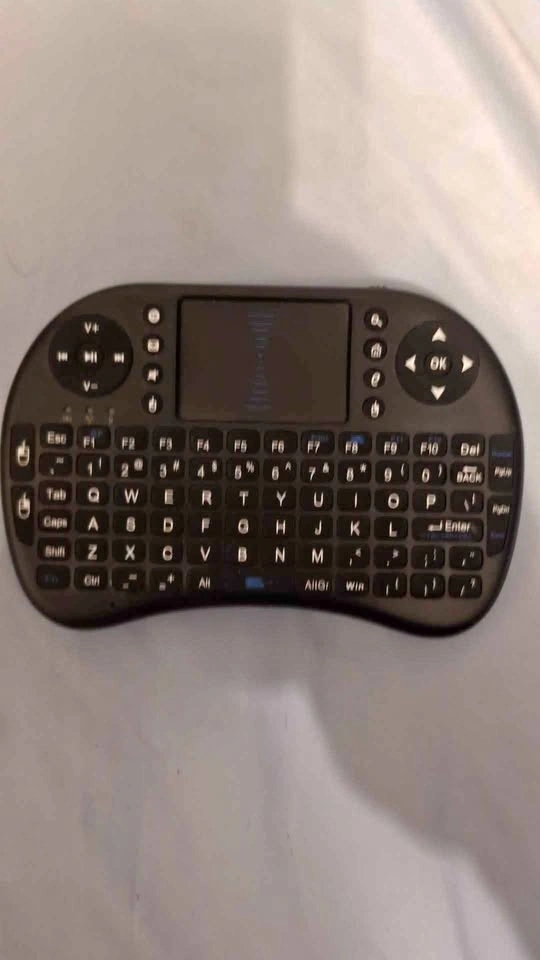 Wireless mini keyboard with a built-in touchpad. Rechargeable battery included. USB charging port. USB cable not included (see USB type needed in last picture).