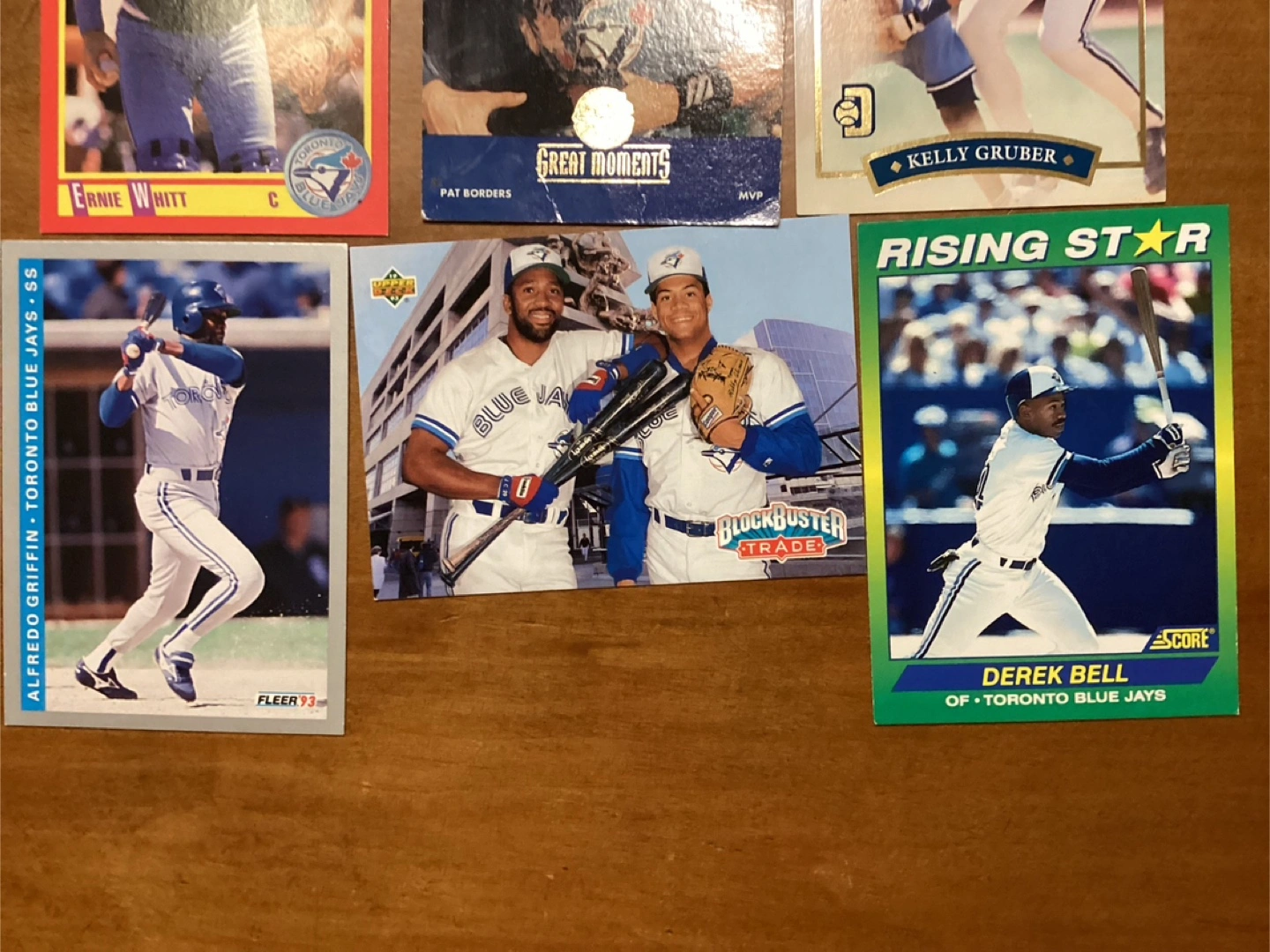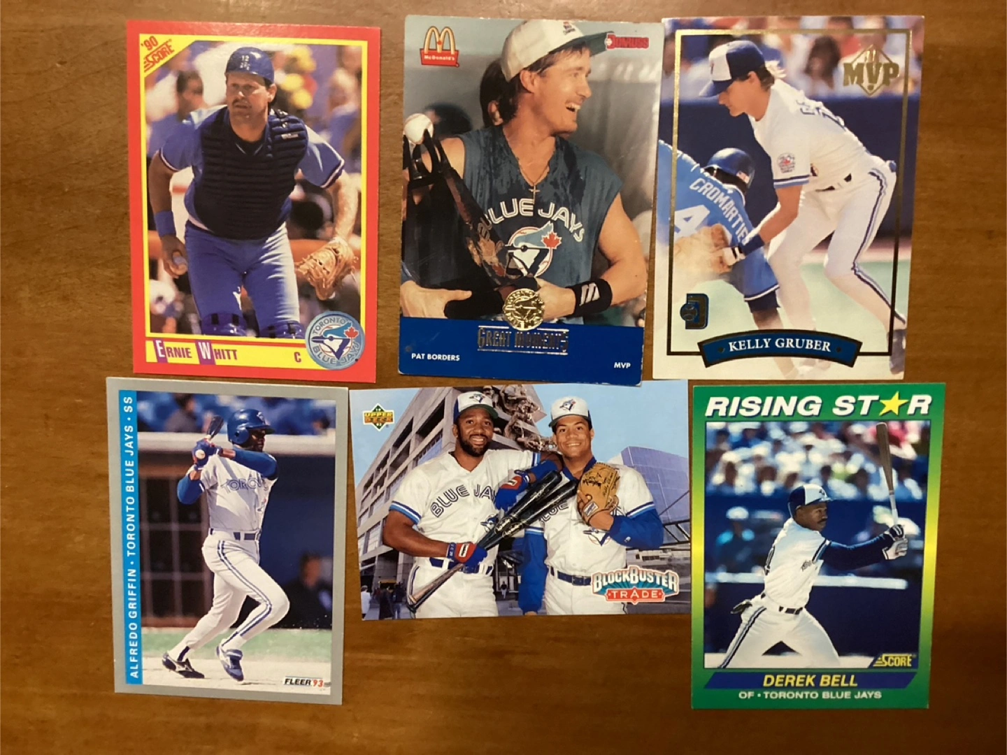 $25.00 for all 6 cards - JOE CARTER & ROBERTO ALOMAR #42, ERNIE WHITT #433, Pt BORDERS #25, KELLY GRUBER 3 of 6, ALFREDO GRIFFIN #692, DEREK BELL #64 - All clean & in MINT condition - Shipping available - Located at Pape ave & Cosburn ave Toronto - Call Patrick @ 416-930-8338. - Thanks & check out my other posts