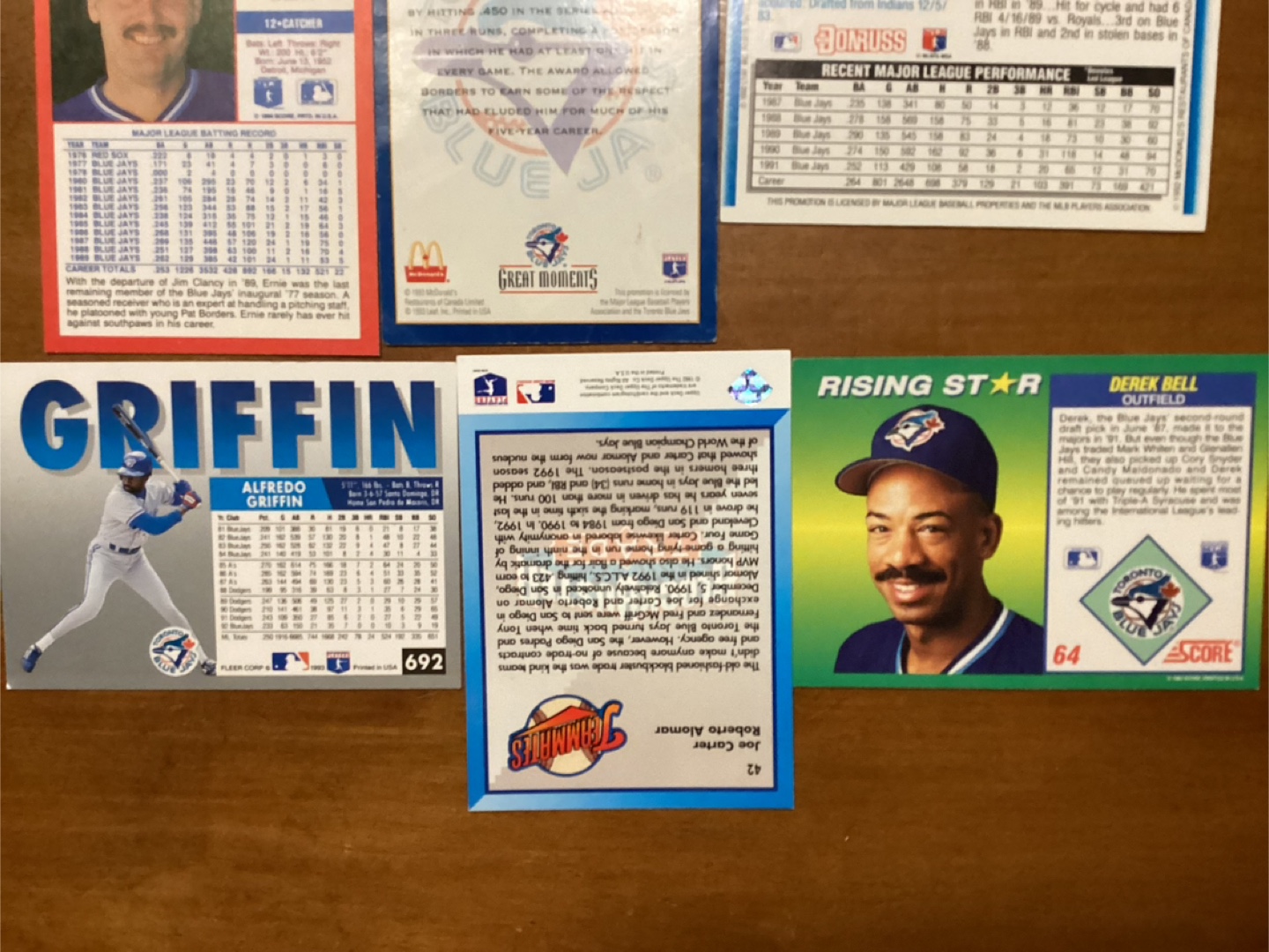$25.00 for all 6 cards - JOE CARTER & ROBERTO ALOMAR #42, ERNIE WHITT #433, Pt BORDERS #25, KELLY GRUBER 3 of 6, ALFREDO GRIFFIN #692, DEREK BELL #64 - All clean & in MINT condition - Shipping available - Located at Pape ave & Cosburn ave Toronto - Call Patrick @ 416-930-8338. - Thanks & check out my other posts