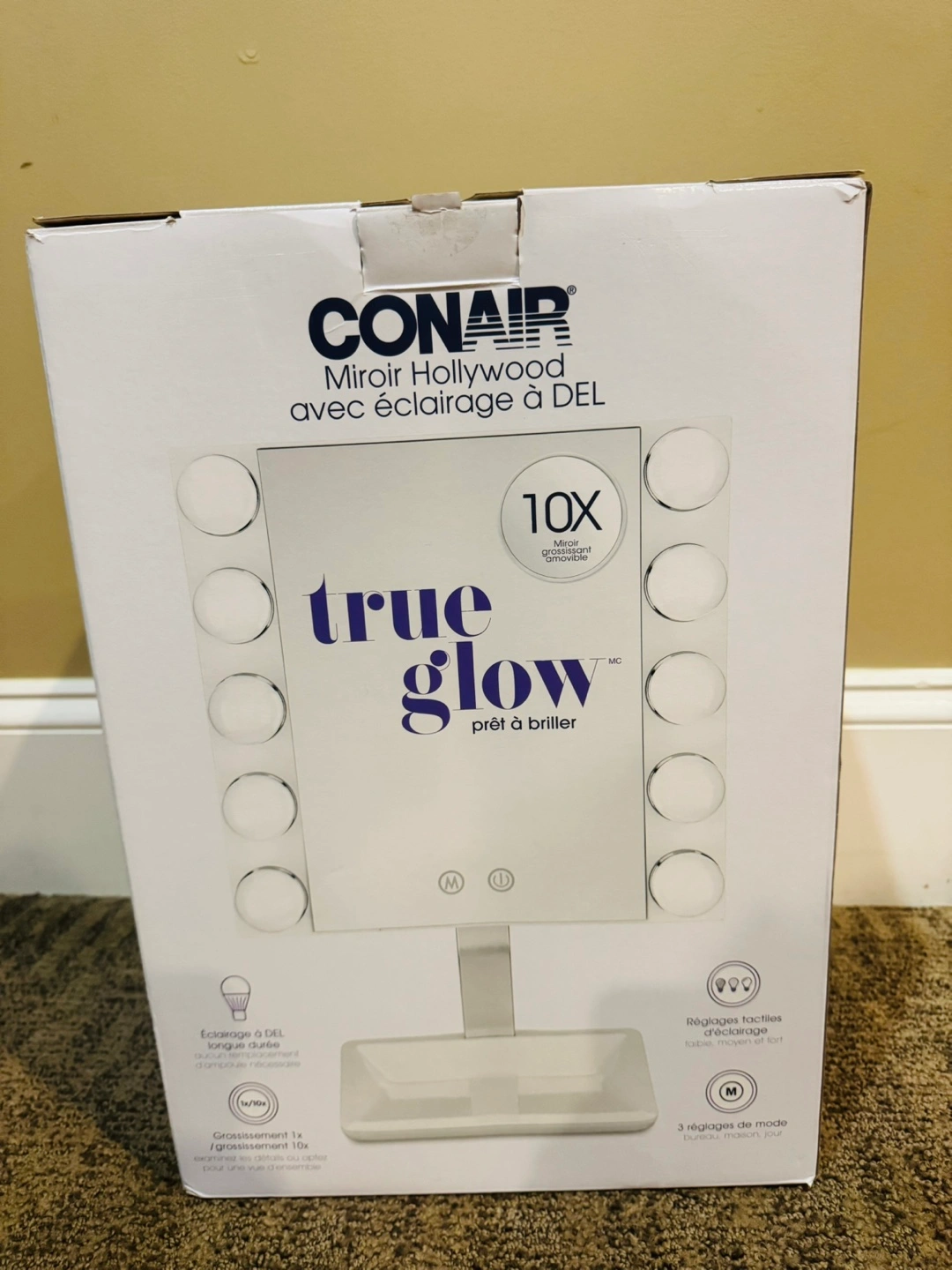 Selling a Conair True Glow Hollywood mirror! It comes with LED lighting, so the bulbs never need replacing. It also features 3 light settings and 3 mode settings. It has a 1x magnification/10x spot to get up close and personal or take in the whole view. The mirror is distortion free and has 25° rotation. The USB cord and adapter are included, and it has an aluminum stem with a gloss white finish