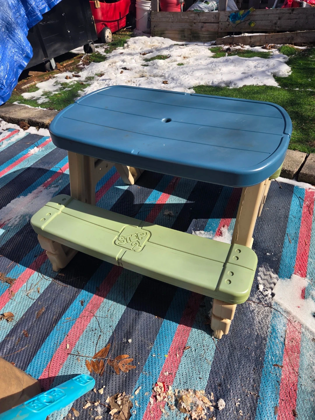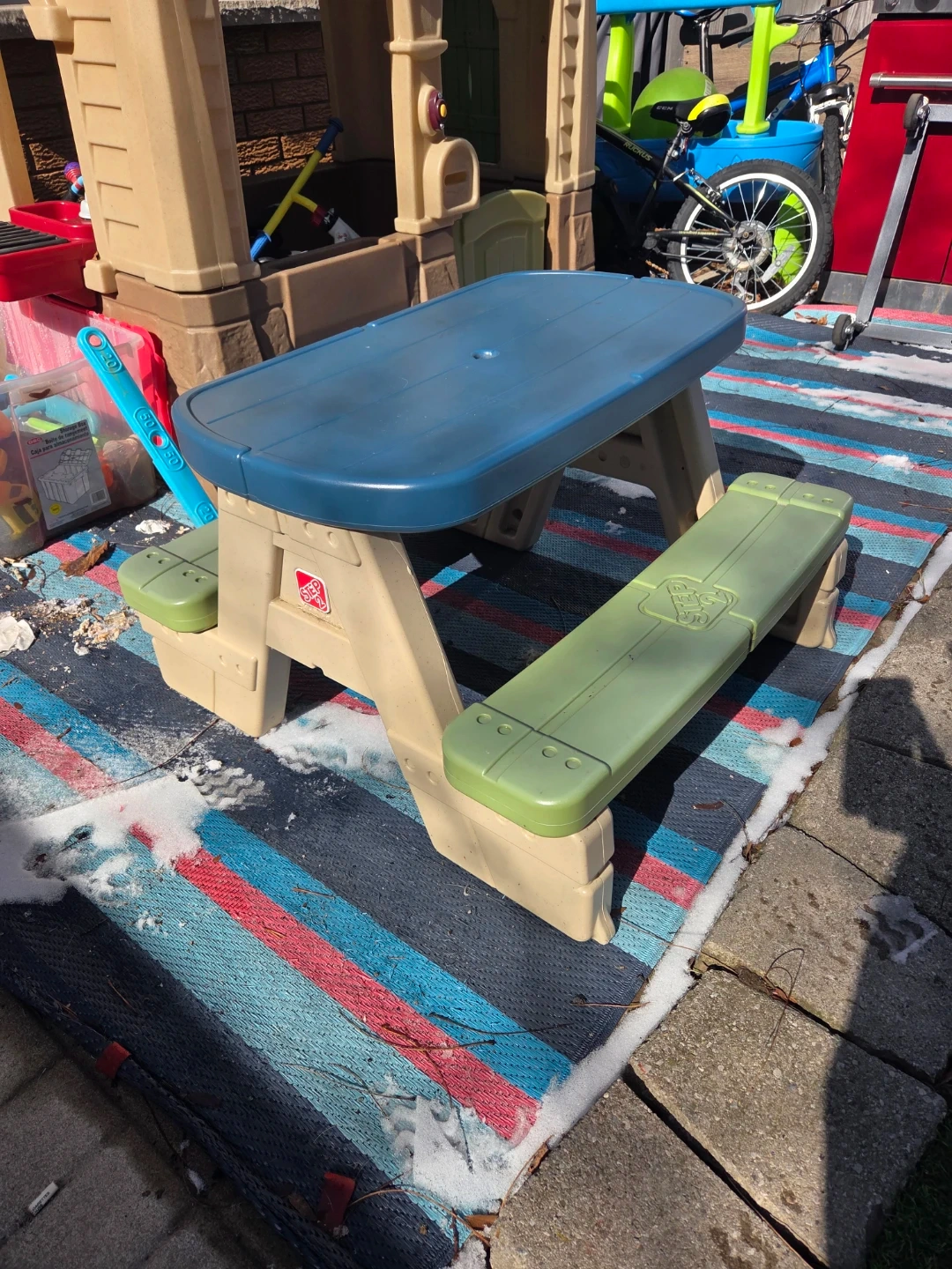 A durable Step2 picnic table with two attached benches. Beige and tan base with a blue tabletop and green benches. Easy to clean plastic material.